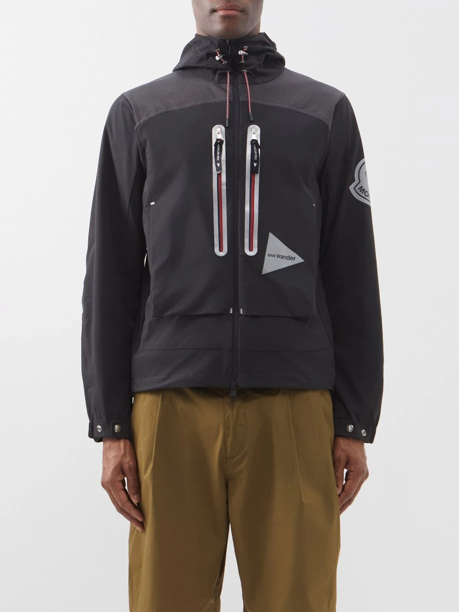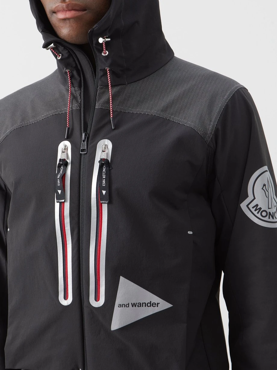 Made in collaboration with Japanese label And Wander, 2 Moncler 1952’s black Itabashi waterproof hooded jacket is accented by secure zipped pockets and reflective logo motifs.