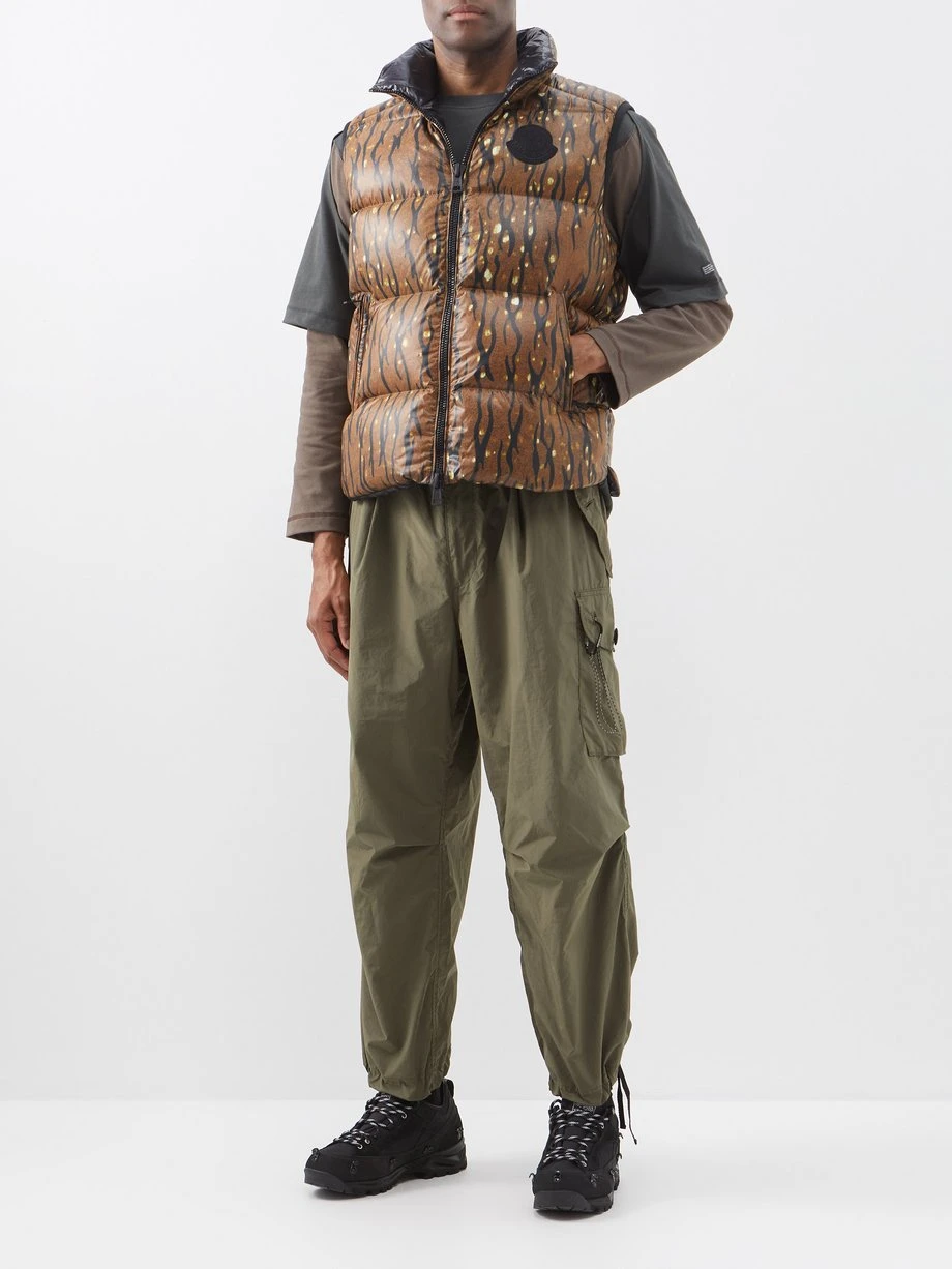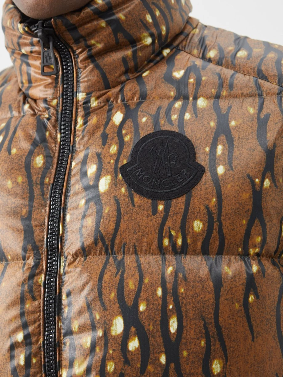 2 Moncler 1952 renders this brown Sumida gilet in glossy nylon laqué that’s printed with a tiger-stripe camouflage, then quilts it with the label’s warming blend of lightweight down and feathers.