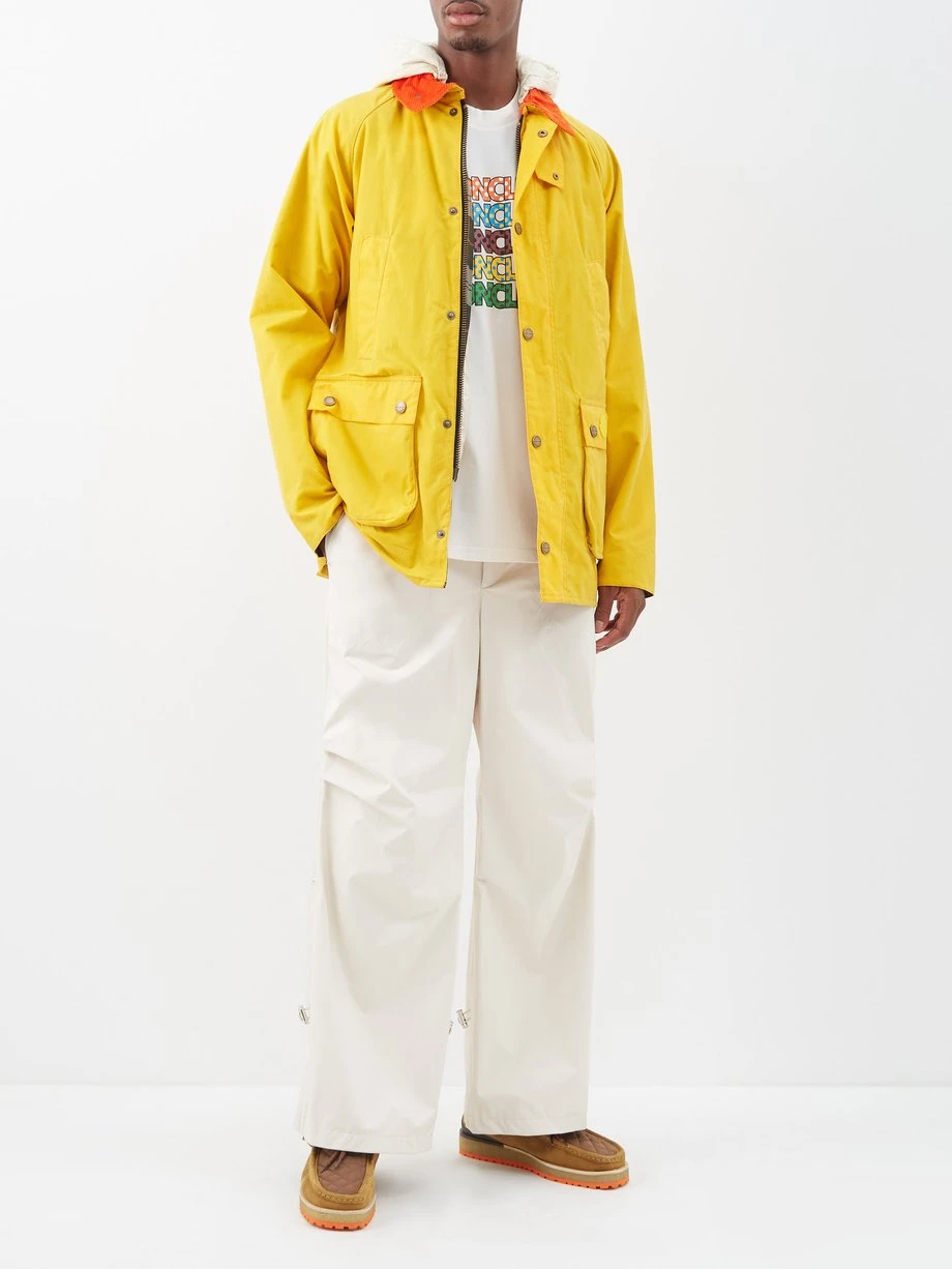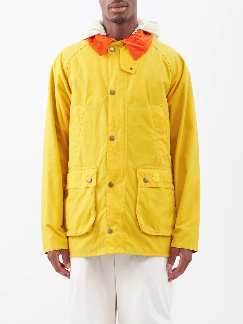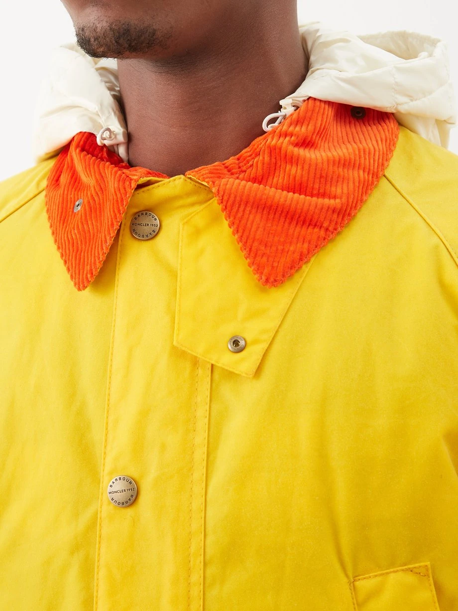 2 Moncler 1952 joins forces with Barbour to put a vibrant twist on the British label’s signature outerwear, such as this bright yellow Wight jacket. It’s crafted from waxed cotton with an orange corduroy collar and a checked lining, then features a detachable, down-packed gilet that ensures optimum warmth.