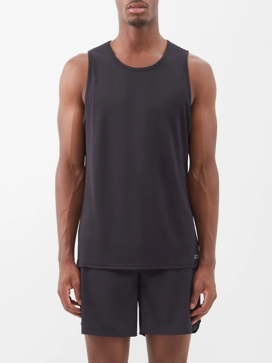 2XU’s black Aero tank top is knitted from moisture-wicking technical jersey printed with reflective logo accents for exercising in low-light conditions.
