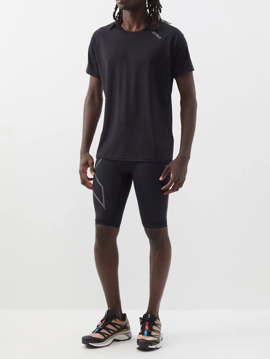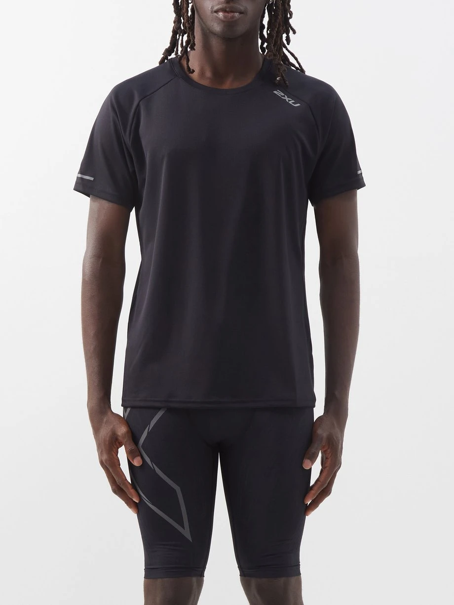 2XU’s black Aero T-shirt is crafted from double-knit technical jersey fitted with a breathable mesh back panel, designed to the body cool on long runs.