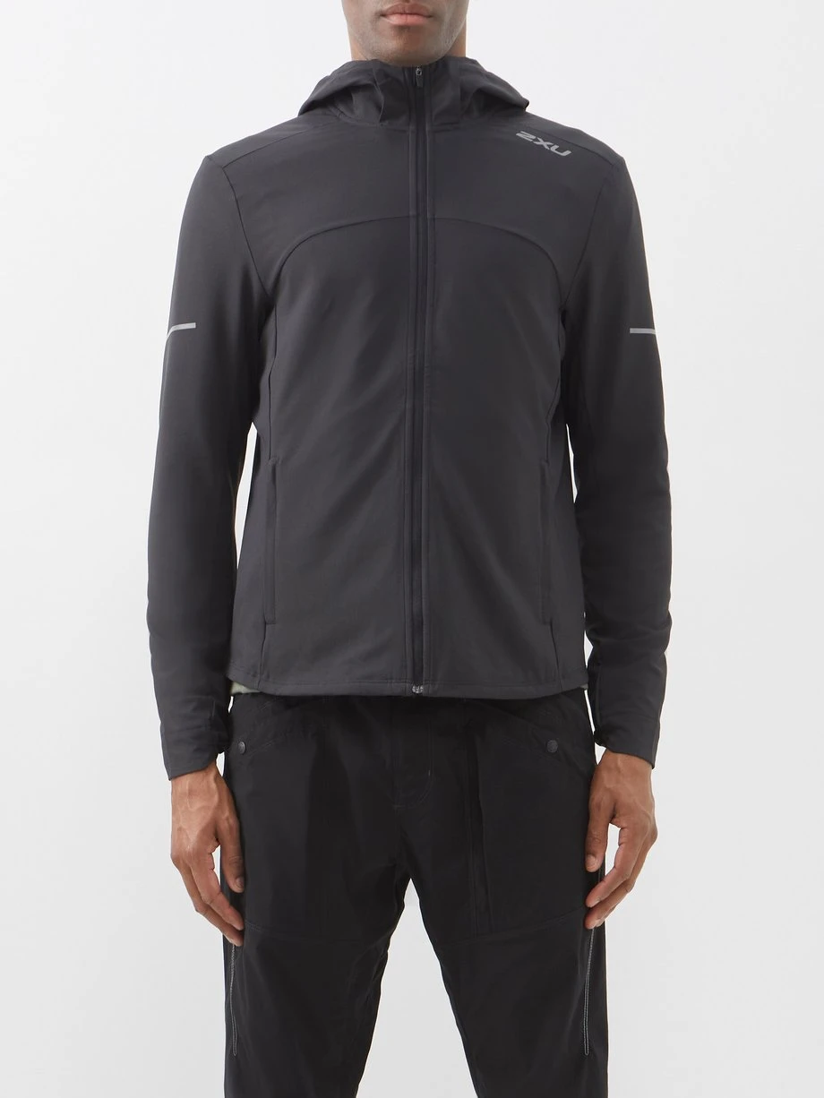 Designed for all-weather runs, 2XU renders this black Aero jacket from a stretch woven water-resistant shell with a back vent to enhance breathability and ventilation.