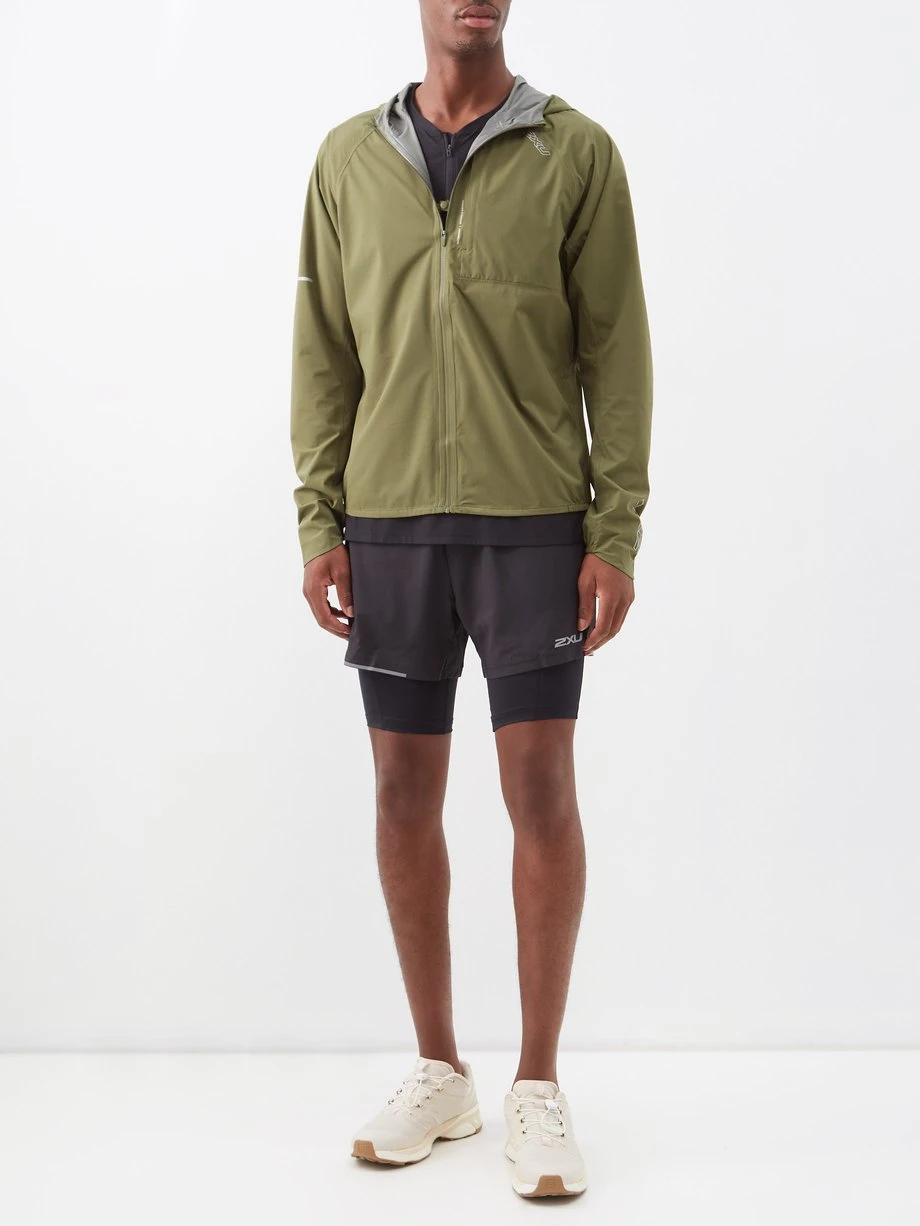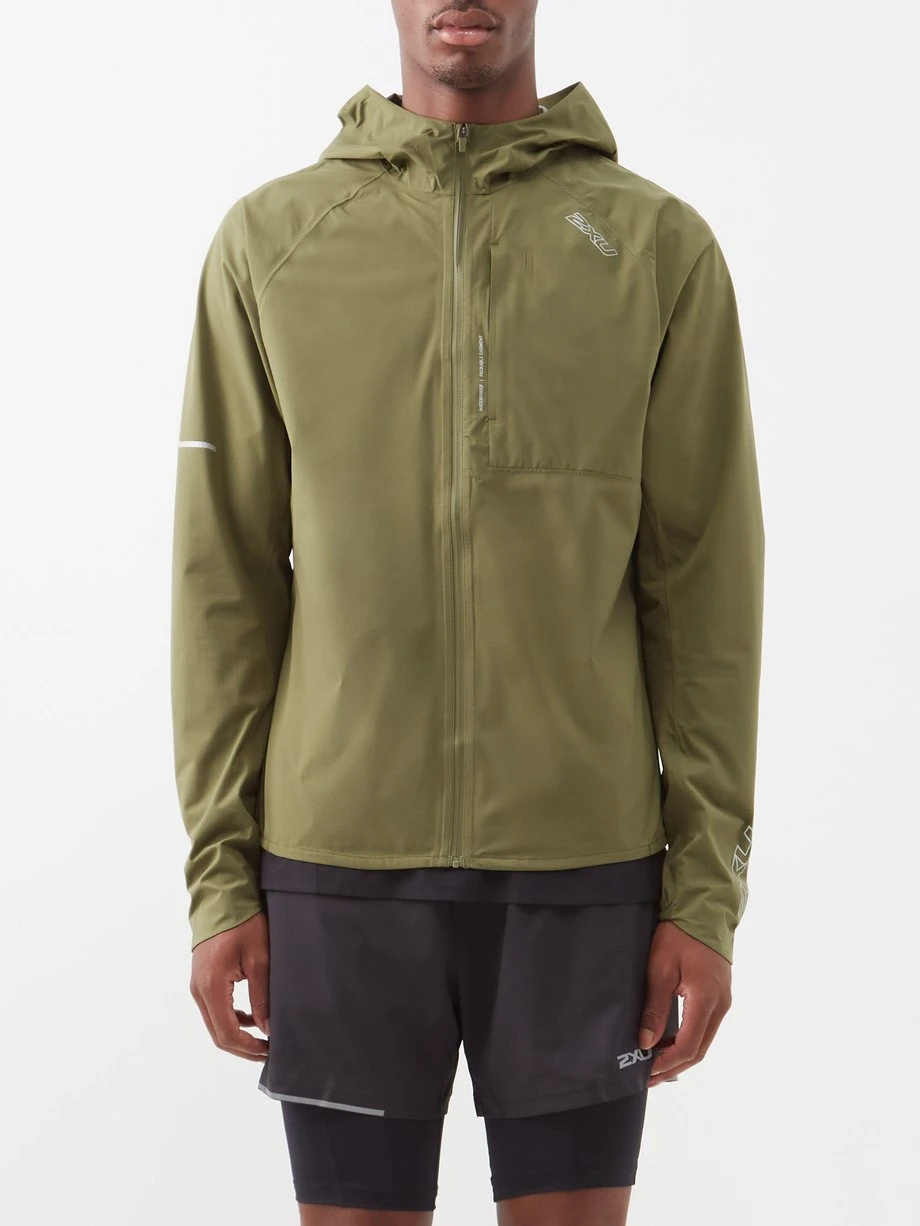 Designed for wet running conditions, 2XU’s khaki-green hooded Light Speed jacket is made from lightweight, waterproof shell fitted with a zipped chest pocket.