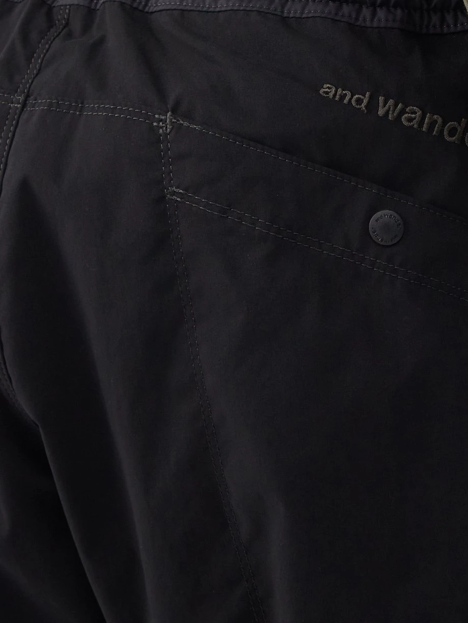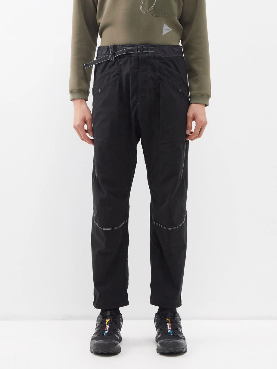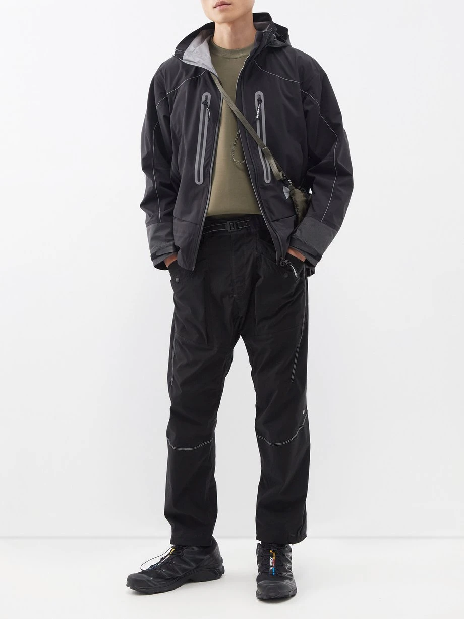 Made in Japan from water-repellent stretch shell, And Wander’s black trousers are seamed with reflective stitching and shaped to a slim leg.
