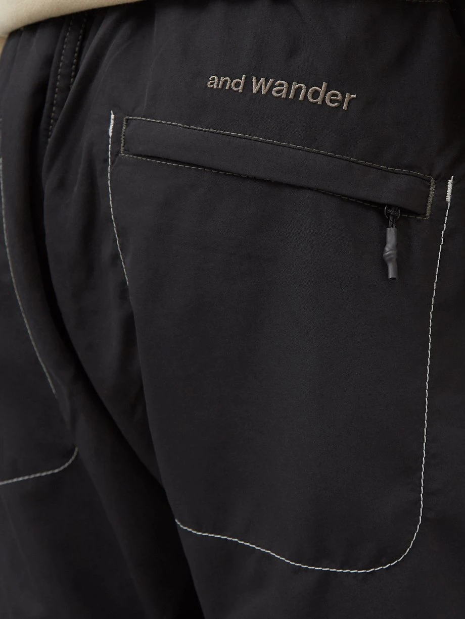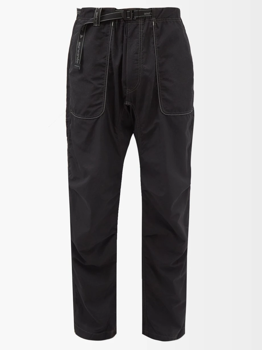 Japanese outerwear label And Wander crafts these black climbing trousers from durable, water-repellent nylon topstitched with reflective threads and embroidered with a grey logo.