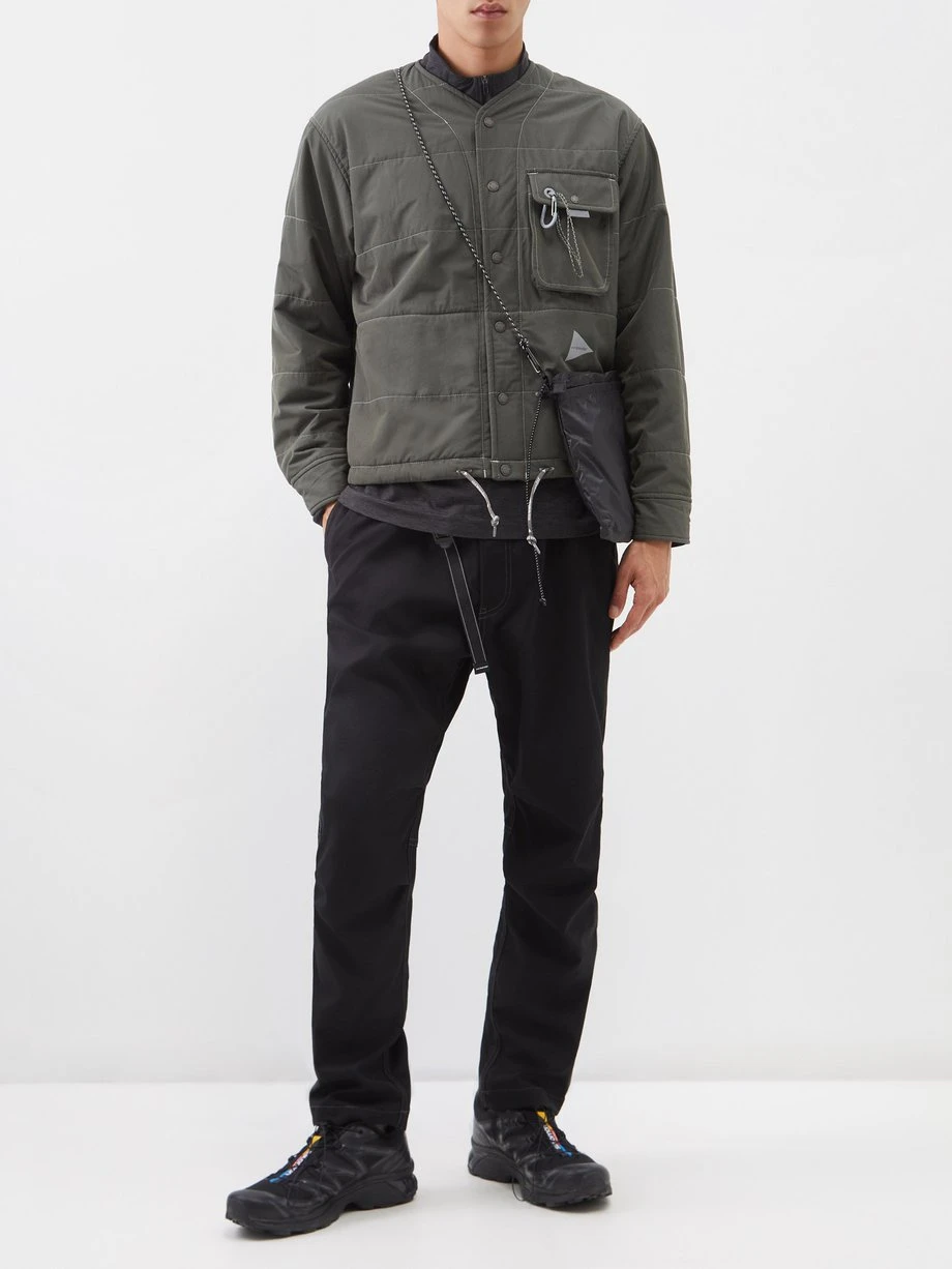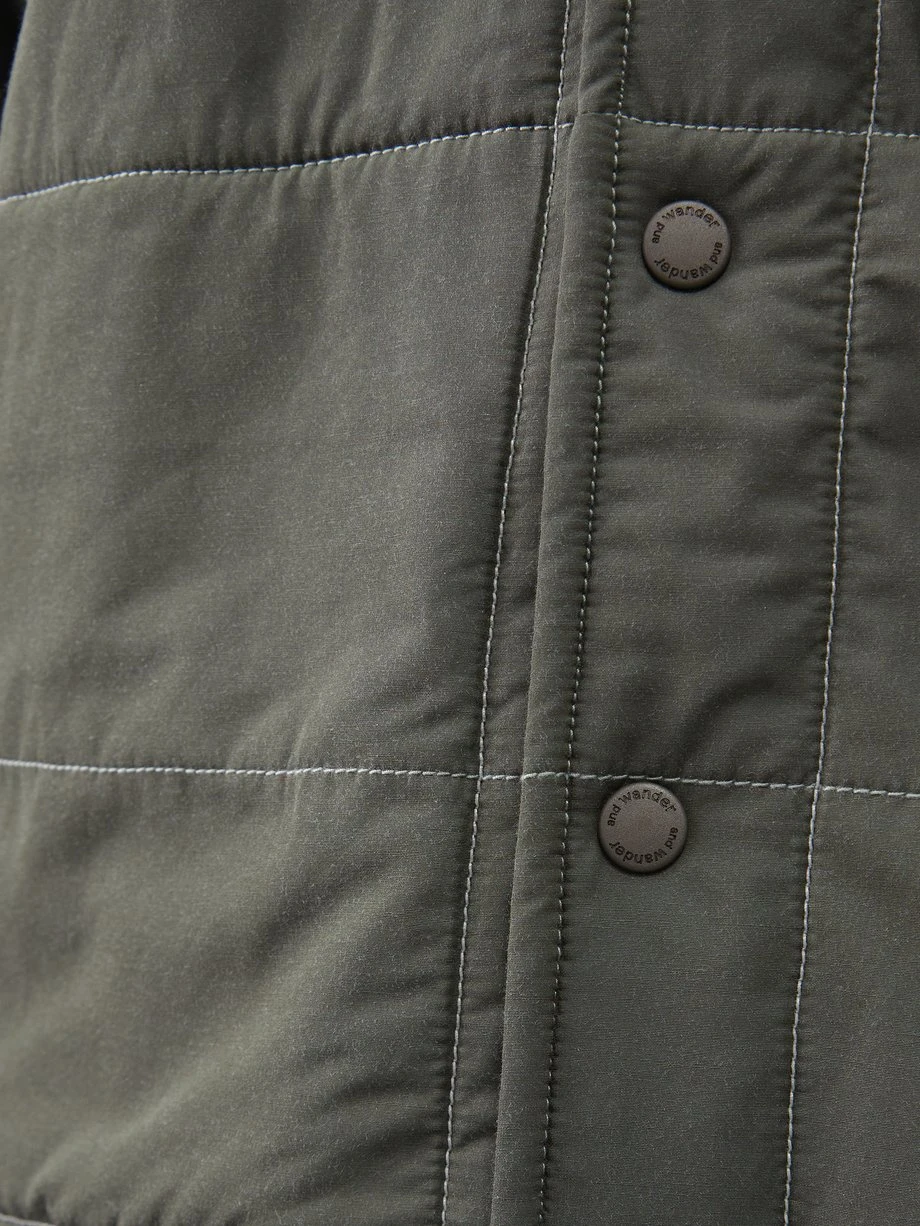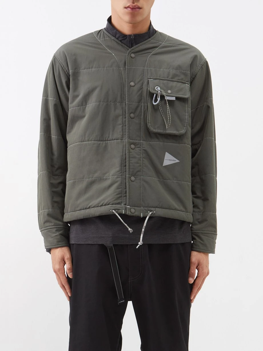 Designed for exploring the outdoors, And Wander’s khaki-green T/C Alpha jacket is made from water-repellent shell with insulating padding and reflective accents.