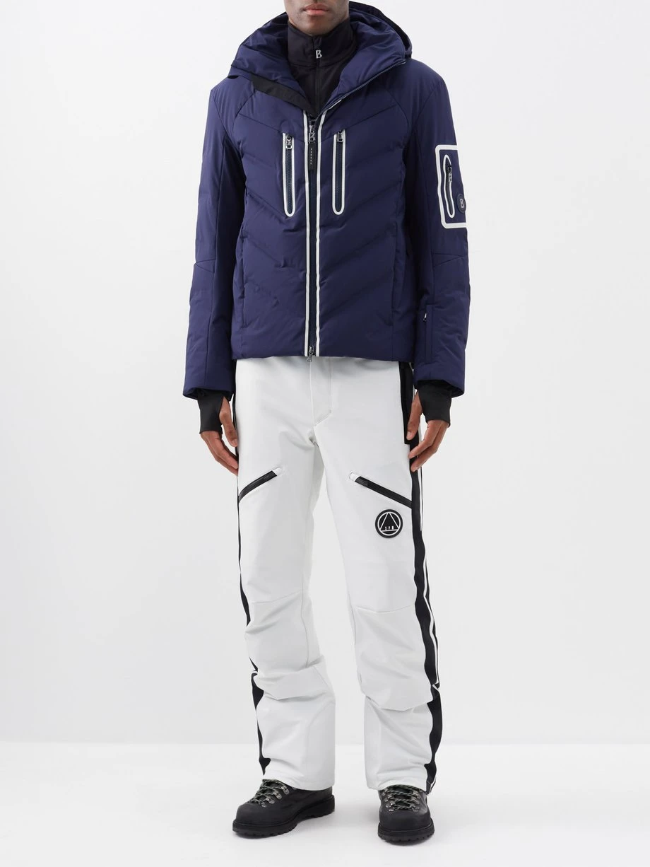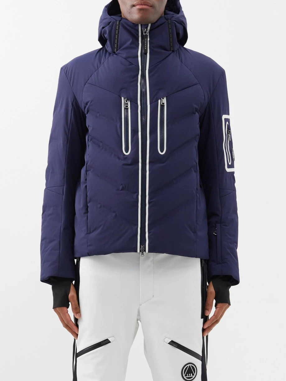 Designed for ultimate performance during cold-weather pursuits, Bogner’s navy Felian-D ski jacket is crafted from waterproof four-way-stretch shell with a neoprene windbreaker and packed with heat-preserving goose down. A detachable hood, quilted collar, snow guard and stretch cuffs with thumbholes help keep the elements at bay.