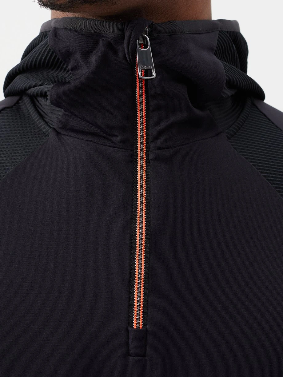 For a stylish and insulating base layer, opt for the slim-fit cut of Bogner’s black and orange Orson quarter-zip top. It is crafted from quick-drying and moisture-regulating jersey fitted with a hooded high neckline, making it an ideal accompaniment for long days on the slopes.
