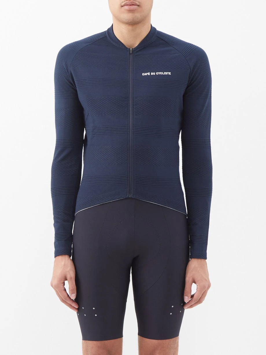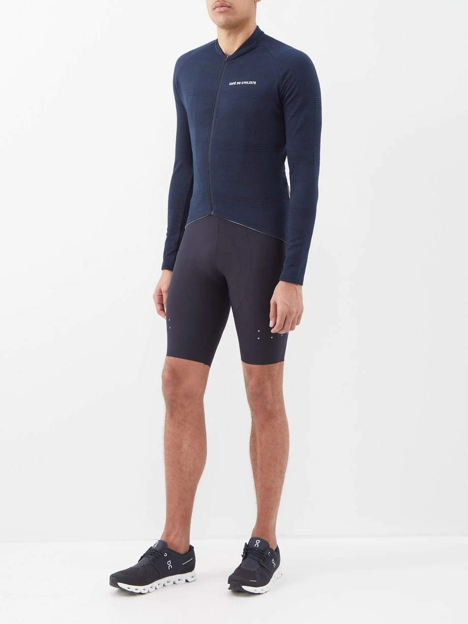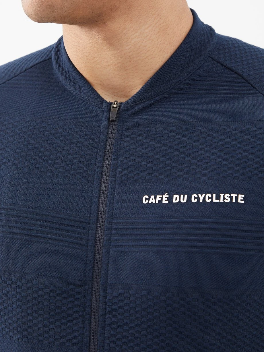 The textured handle of Café Du Cycliste’s navy technical-jersey Corinne top is ergonomically designed to improve airflow and body-temperature control in a range of weather conditions.