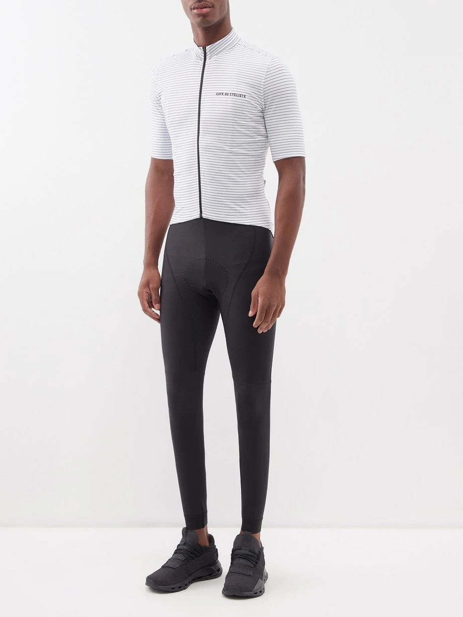 Café du Cycliste’s black microfibre Marie bib tights are cut slightly higher and fleece-lined for assured warmth on winter rides, and fitted with a CyTech chamois.