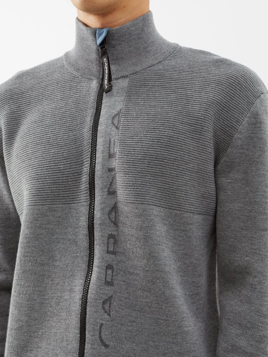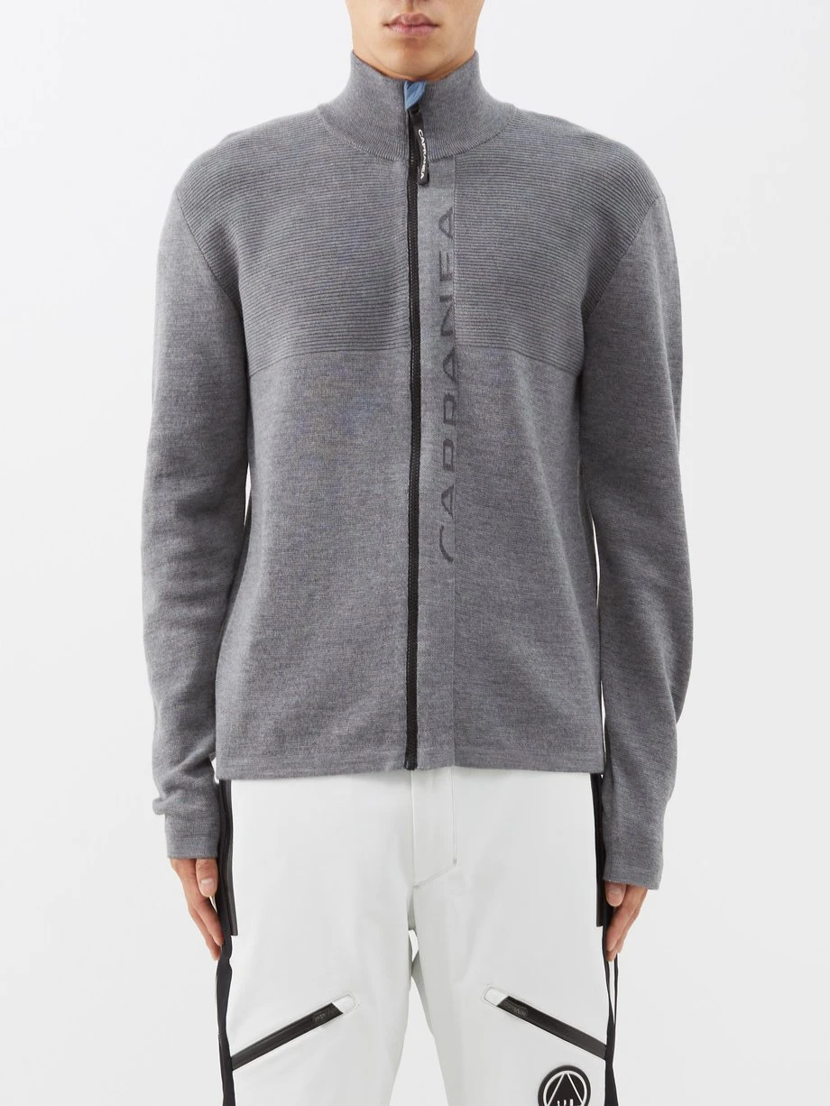 Capranea’s grey mid-layer Titlis top is hallmarked with the label’s logo intarsia knit down the placket and printed on the zip pull. It’s crafted in Europe from the finest merino wool by Italian Tollegno with ribbed hems and a double layered collar.
