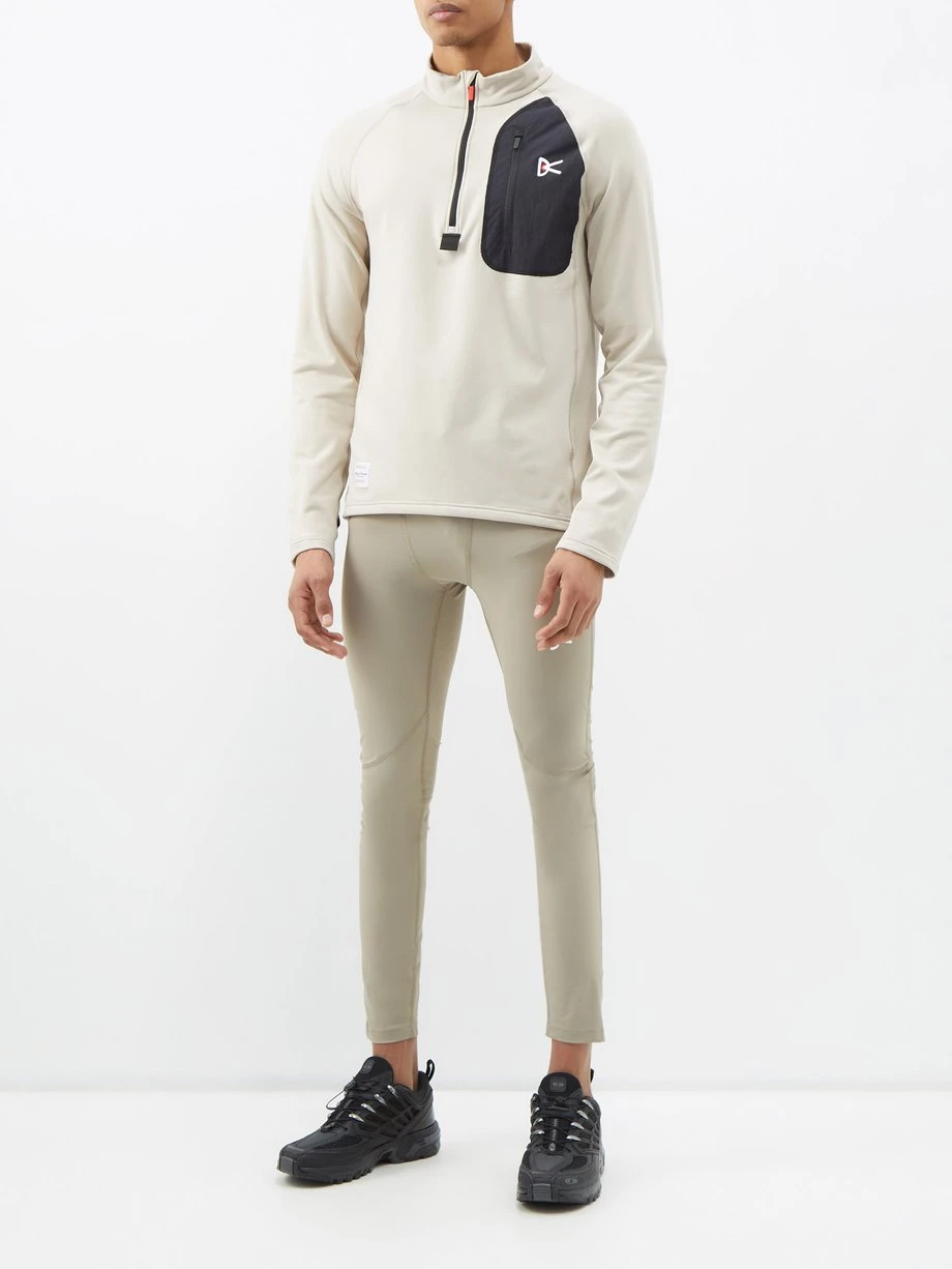 District Vision’s beige Luca running top is made from recycled stretch polyester with a fleece-lined interior and waterproof shell zipped pocket.