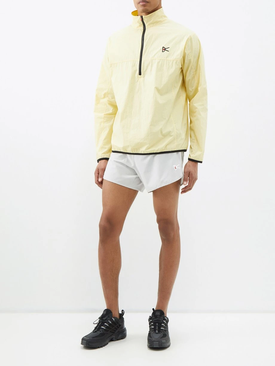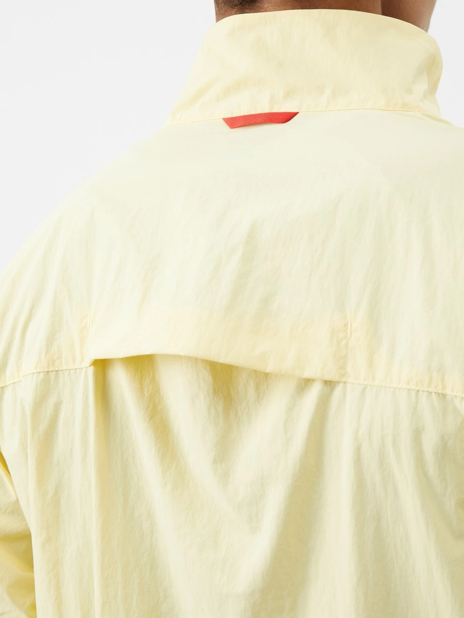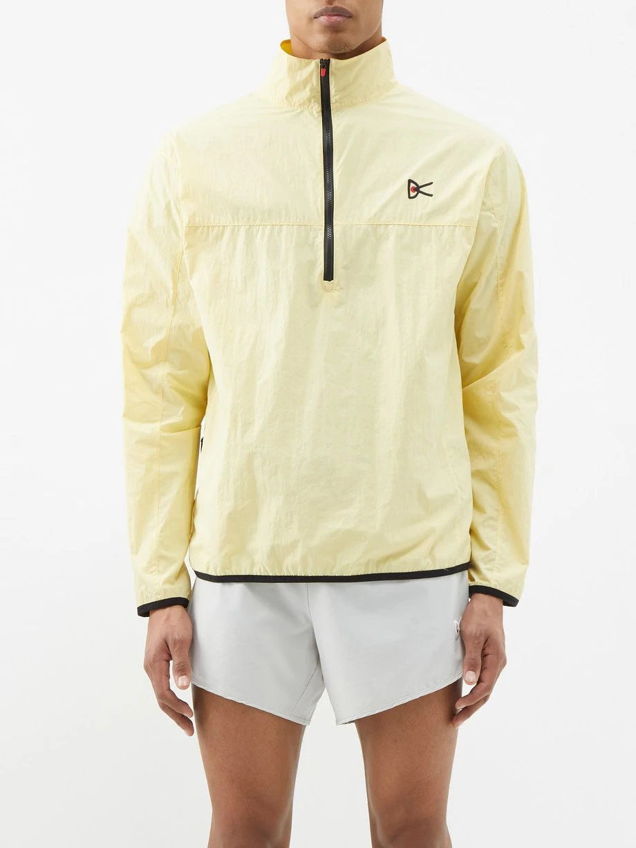 Made with a three-layer water-resistant membrane, District Vision’s soft yellow Theo shell jacket has a half-zip construction and packs away into the rear zip pocket.