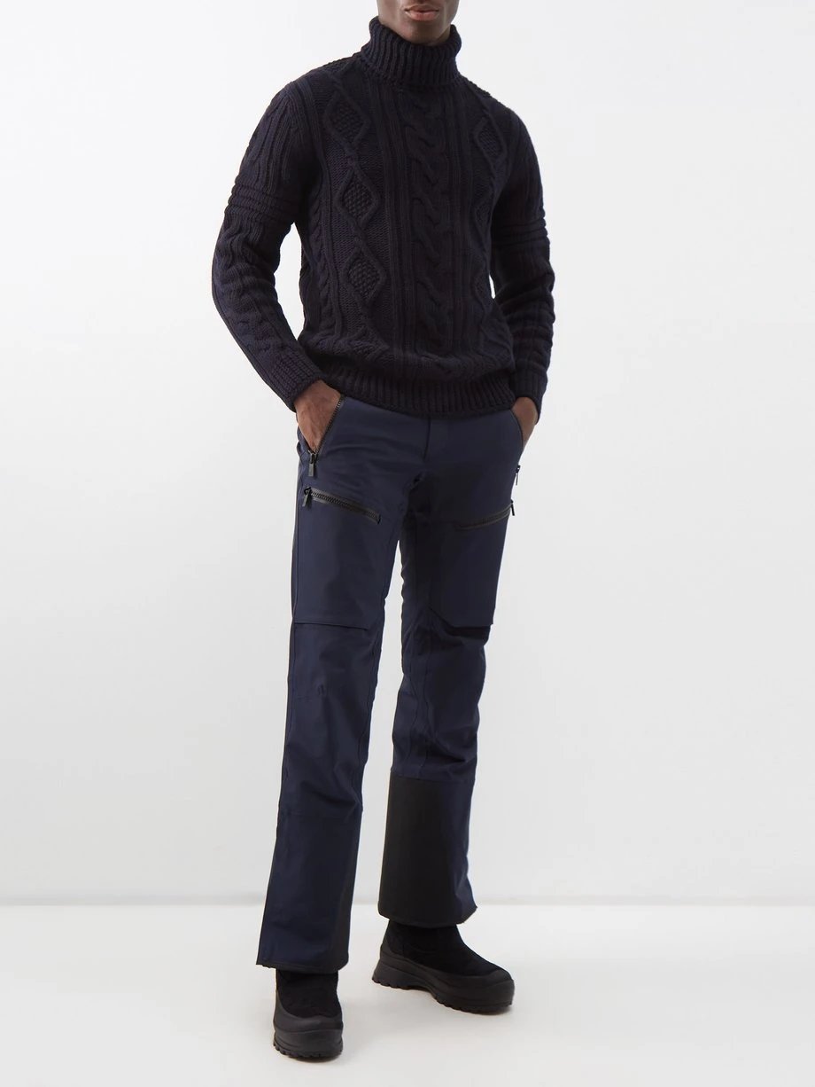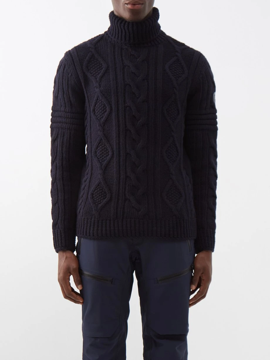 Fusalp’s navy roll-neck Billie sweater is made from soft wool blended with a touch of cashmere, then knitted with chunky cables for a classic finish.