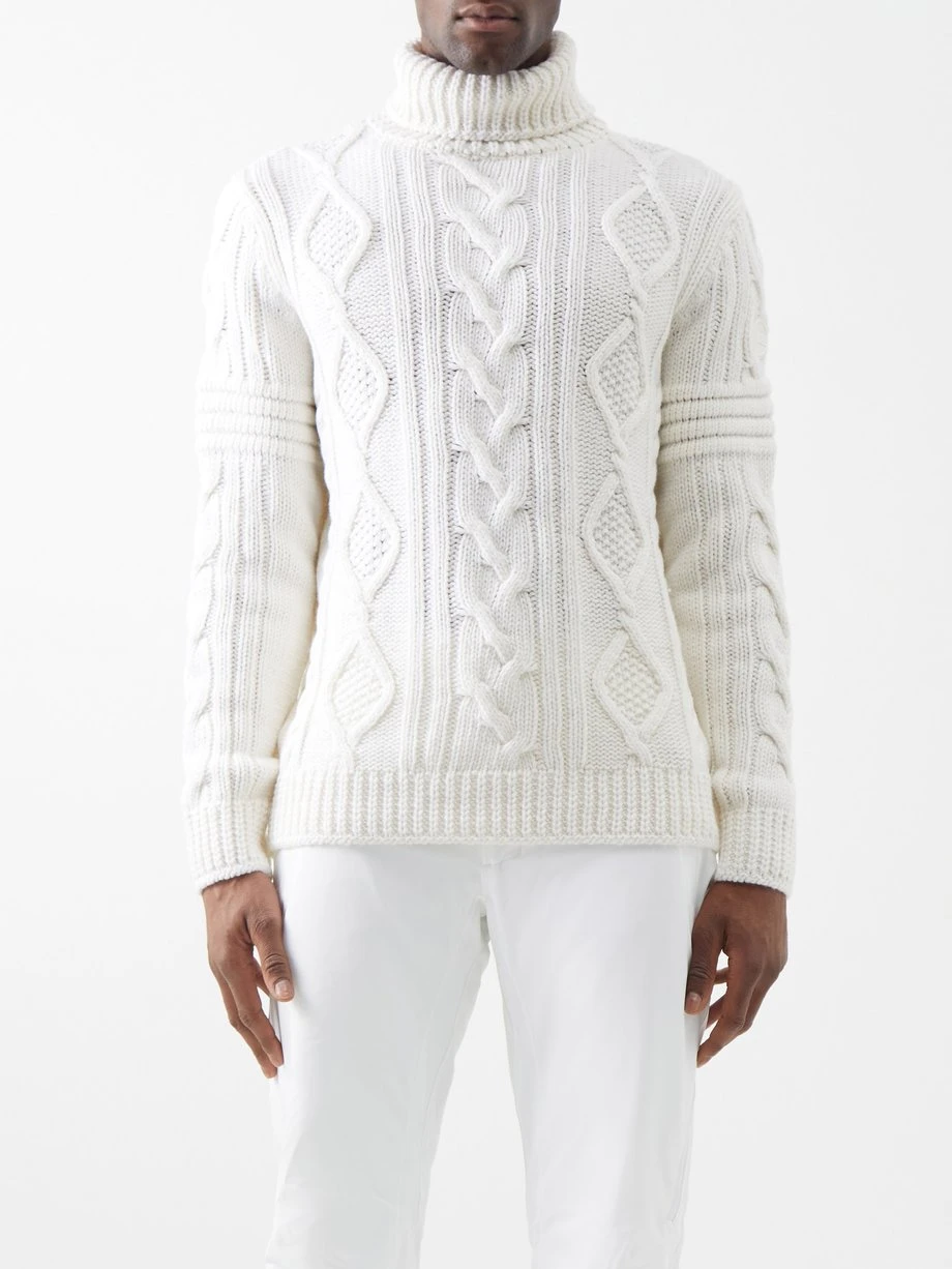 Fusalp’s white Billie roll-neck sweater is made from a wool and cashmere blend with intricate cable knits, ideal for cold-weather layering.