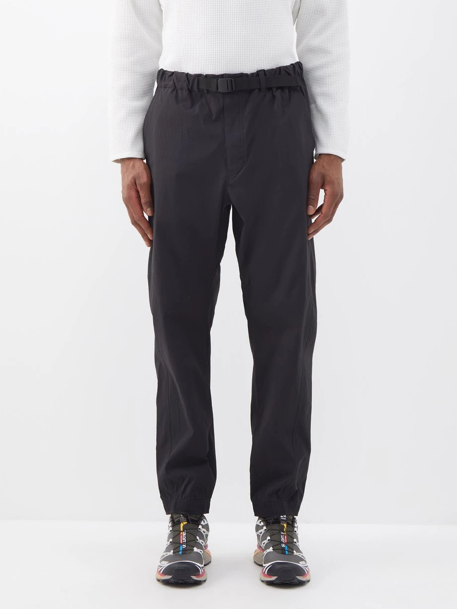 Mobility is key for GOLDWIN’s utilitarian separates, such as these black hiking trousers which are made from durable Cordura® nylon blended with stretch.