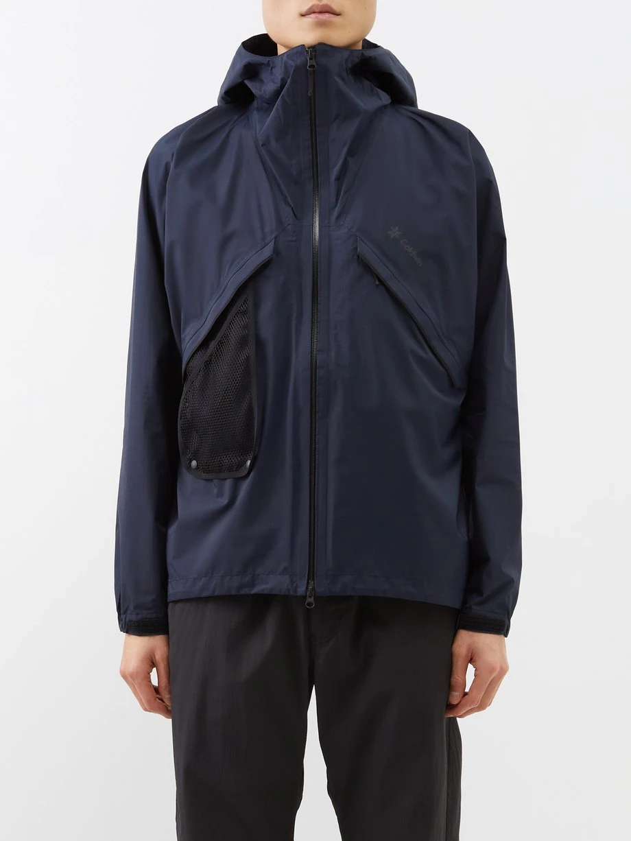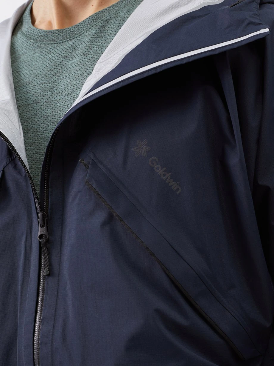 Designed for an active lifestyle, GOLDWIN’s navy Pertex Shieldair jacket is coated for exceptional wind-proofing and features an external mesh pocket for drying damp items.