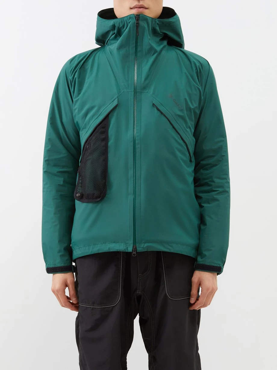 Crafted from ultra-windproof coated technical fabric with sealed seams, GOLDWIN’s green Pertex Shieldair jacket, with an external mesh pocket, offers supreme protection from the elements.