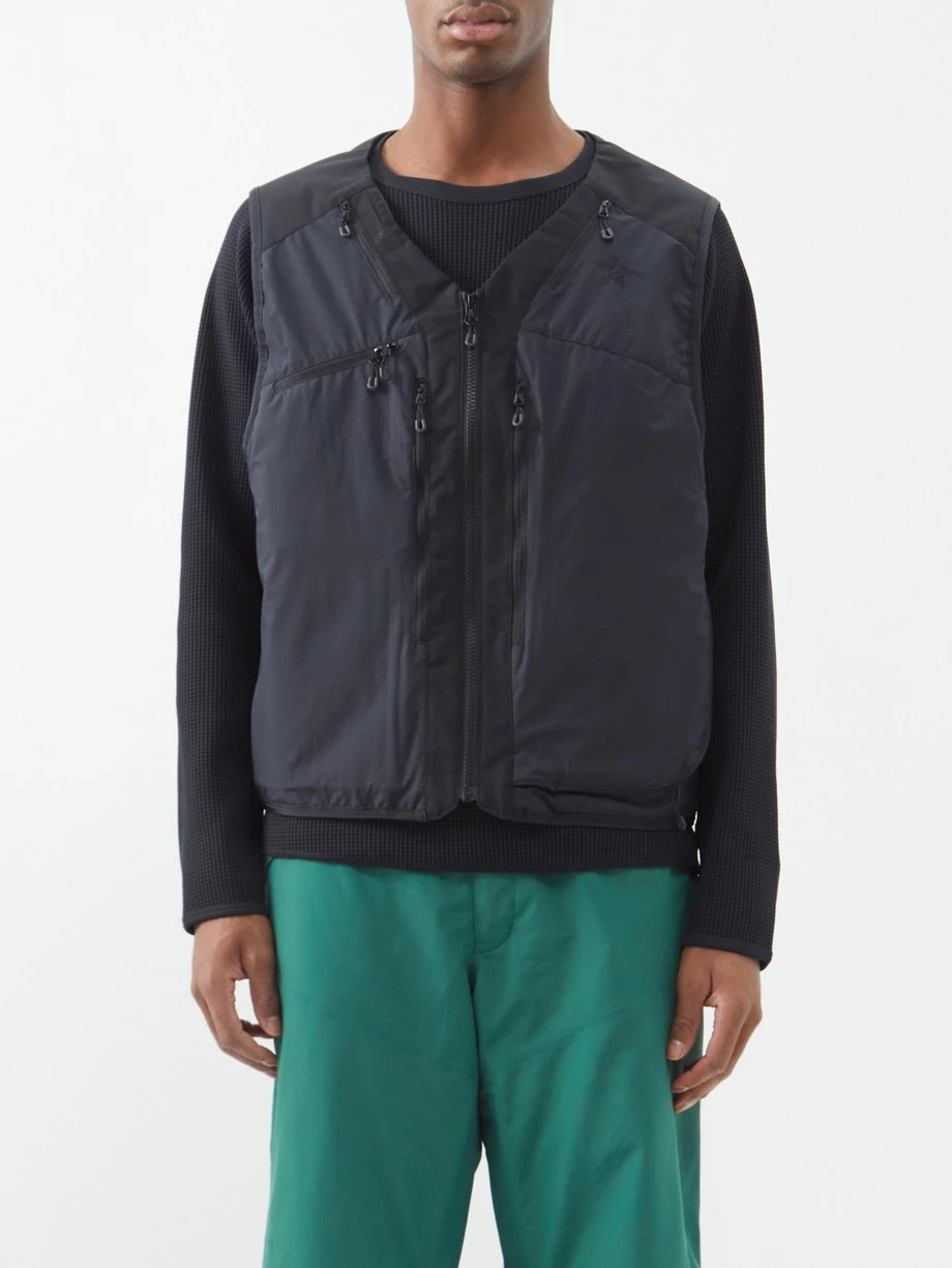 There’s a utilitarian feel to GOLDWIN’s black sleeveless gilet jacket, made from lightweight and waterproof PERTEX™ Shield shell that provides breathable protection against heavy rain.