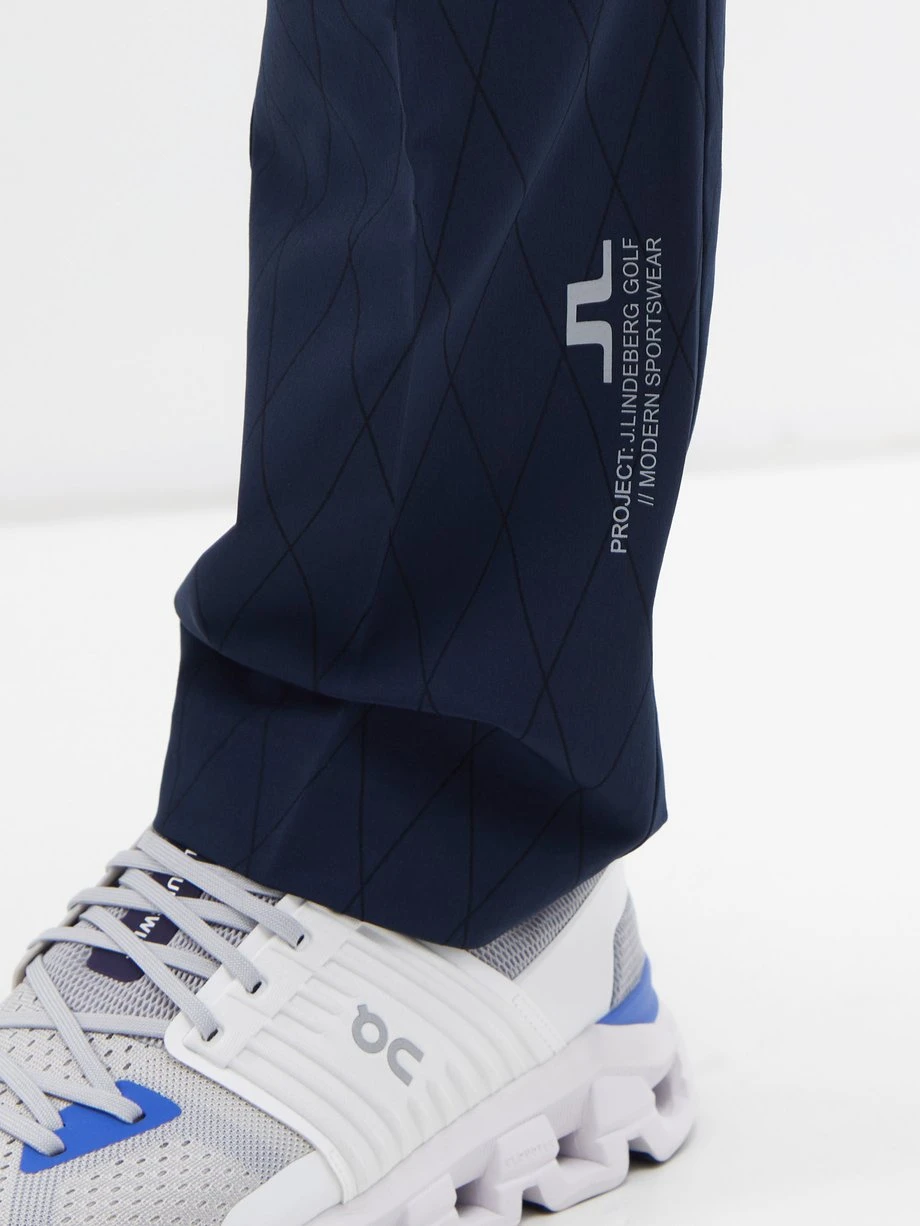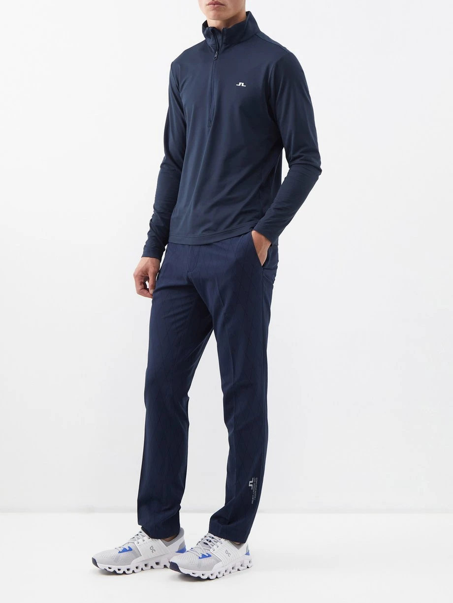 Cut from water-repellent technical fabric, J.Lindeberg’s navy Active golf trousers are printed with an argyle pattern designed to celebrate the 150th Open Championship at St Andrews.