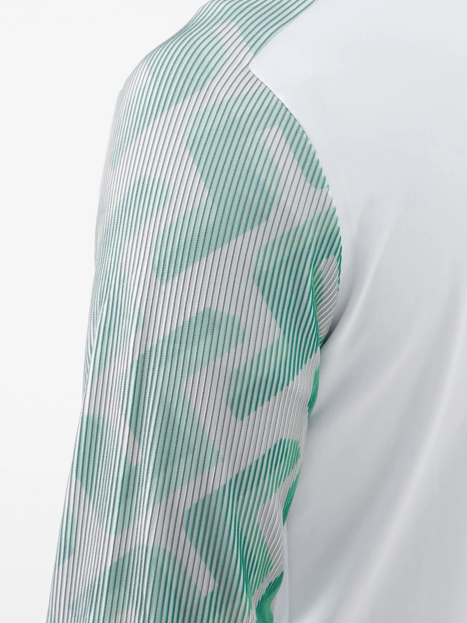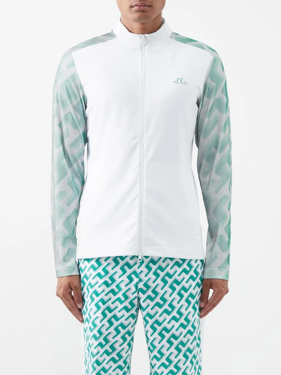 J.Lindeberg’s white Erik jacket is crafted from quick-drying and moisture-wicking fabric with monogram-print ribbed sleeves and a logo printed, zipped front.