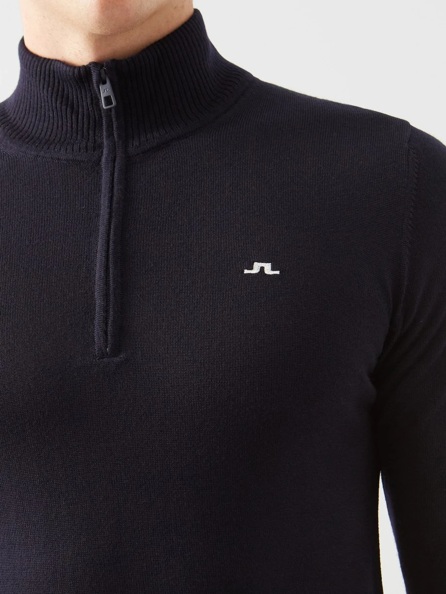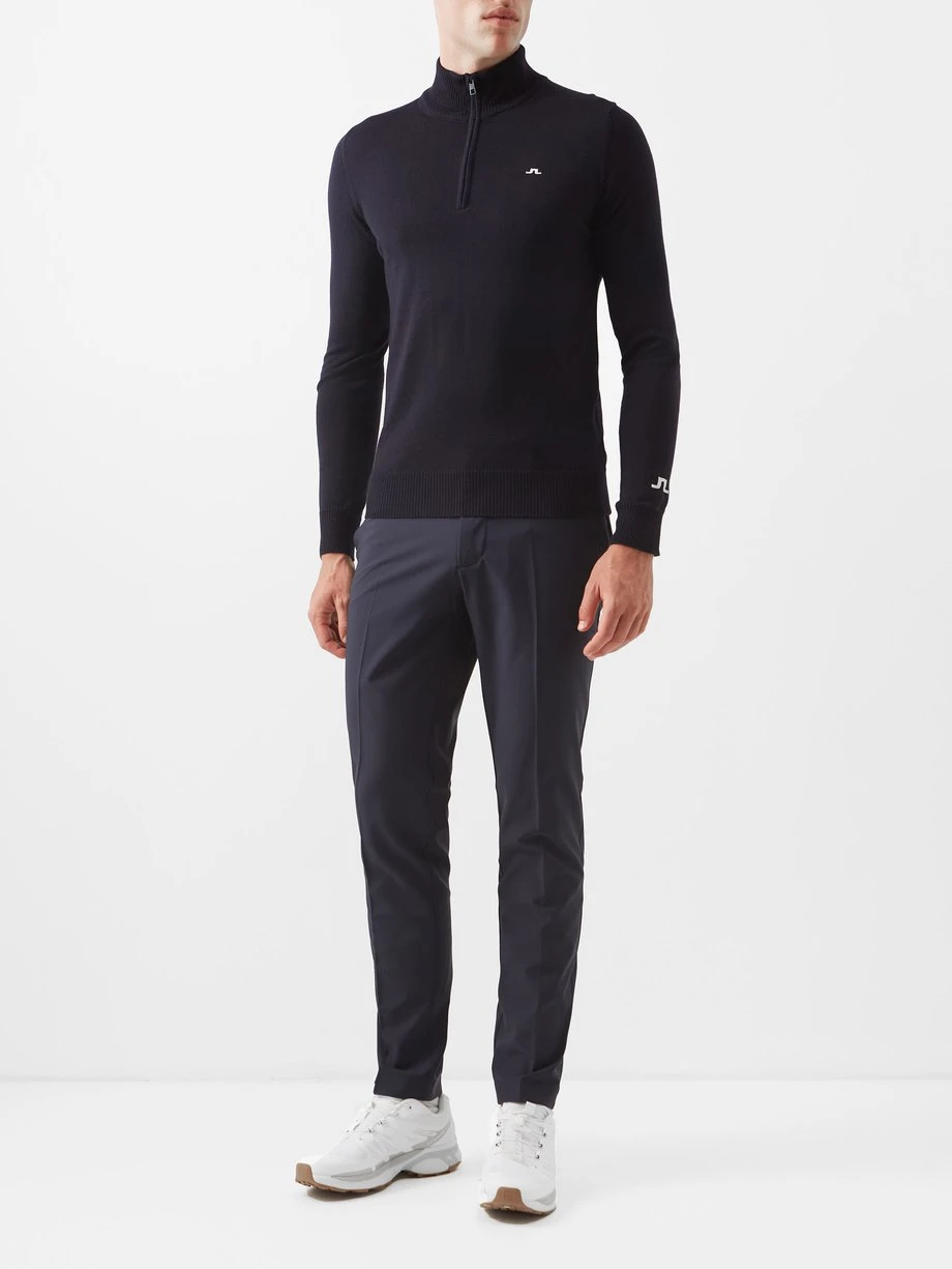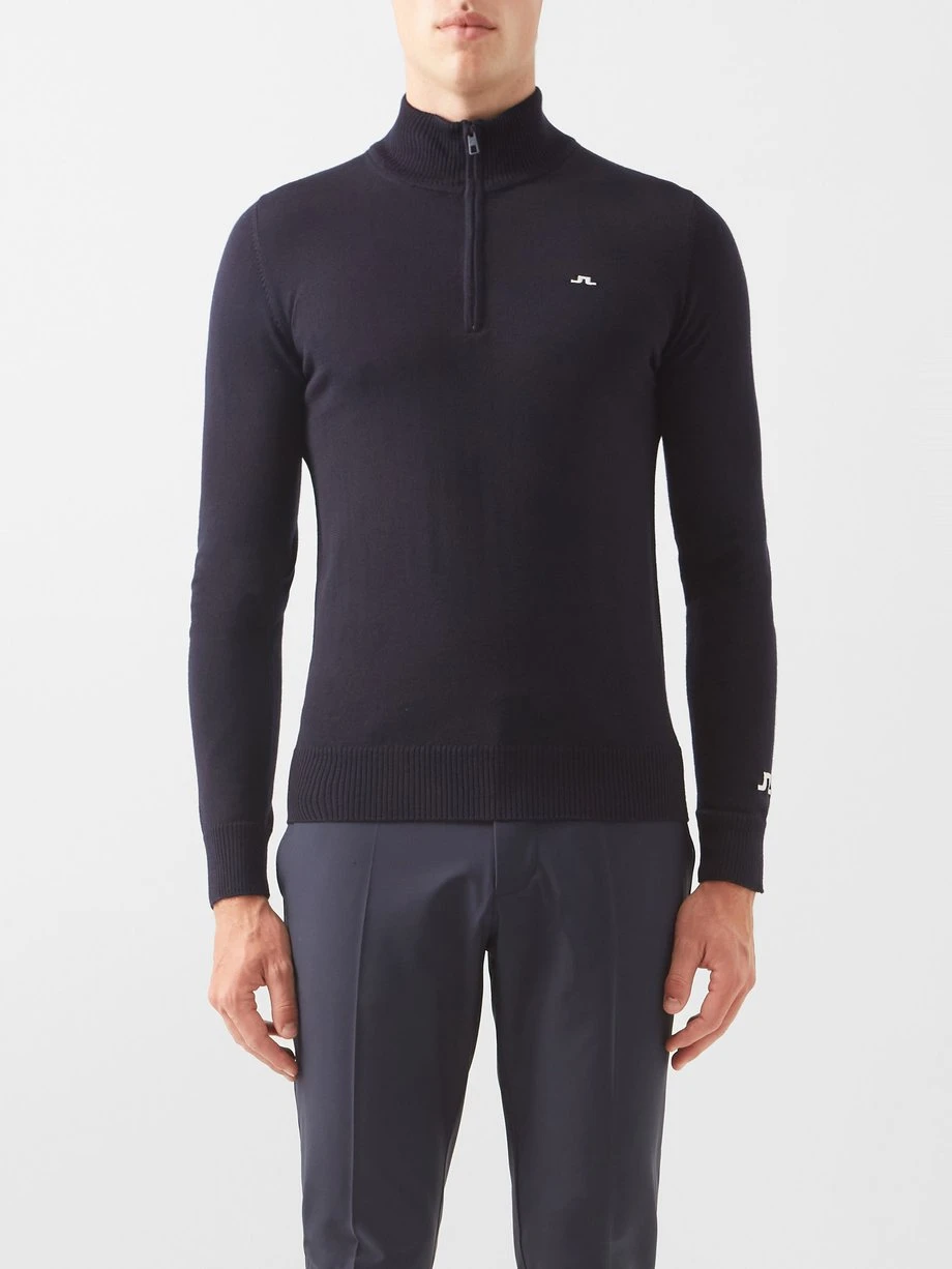 J.Lindeberg’s navy Kian golf sweater is shaped in Italy from fine merino wool with a zip-up collar, tapping into the label’s penchant for sophisticated sportswear.