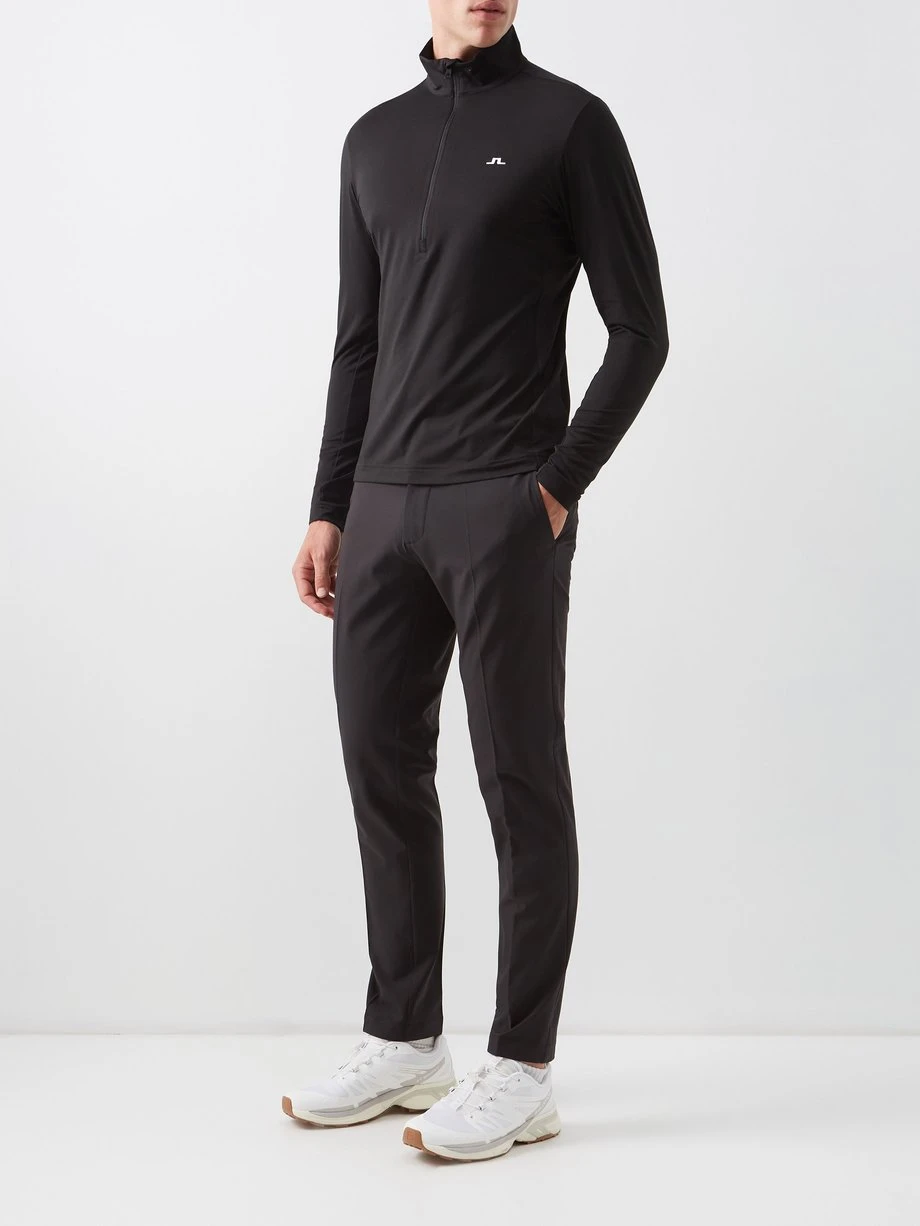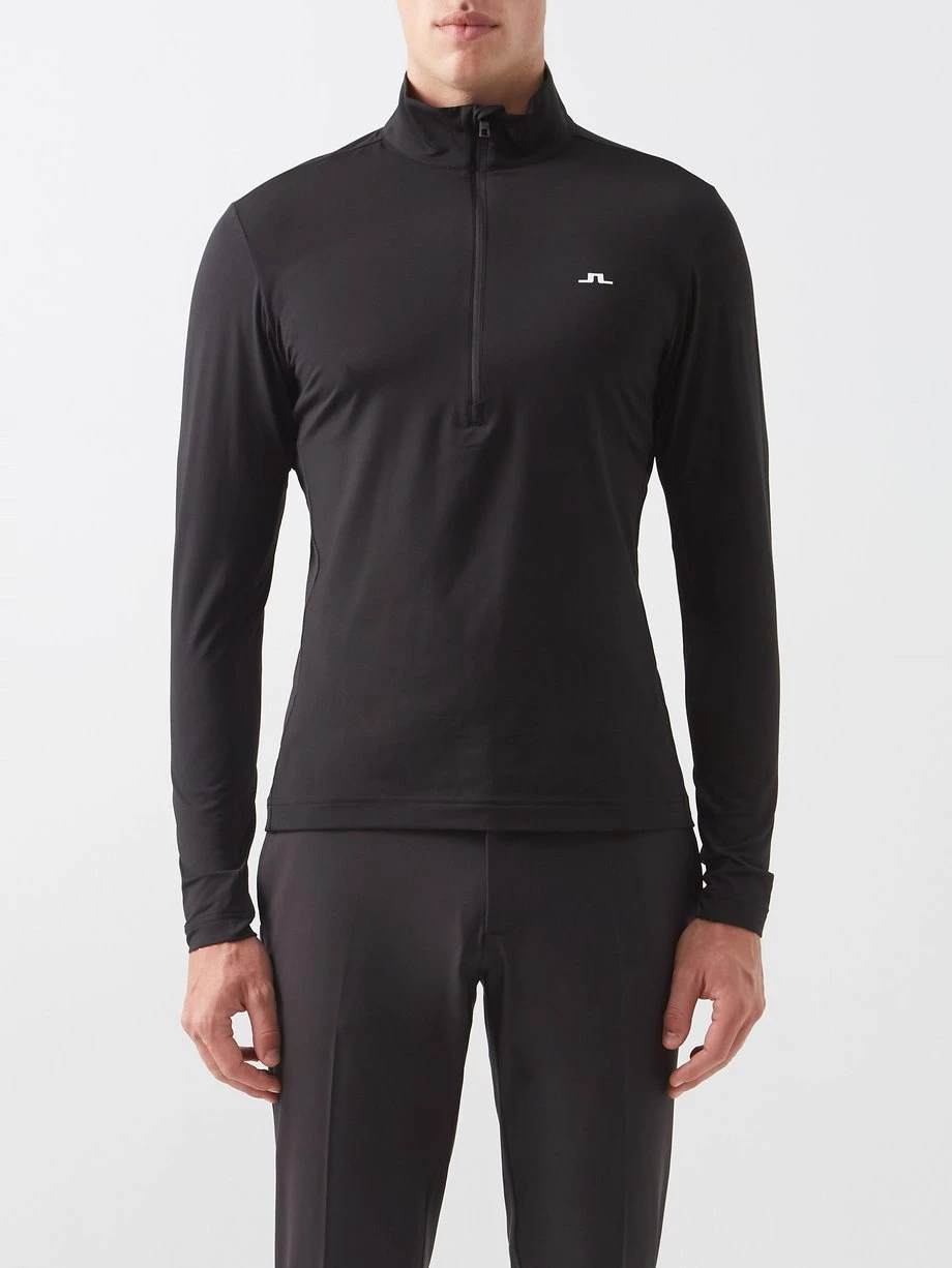 The lightweight construction of J. Lindeberg’s black Luke mid-layer top is a classic choice, complete with flat lock seams to prevent chafing and a logo at the neck and nape.