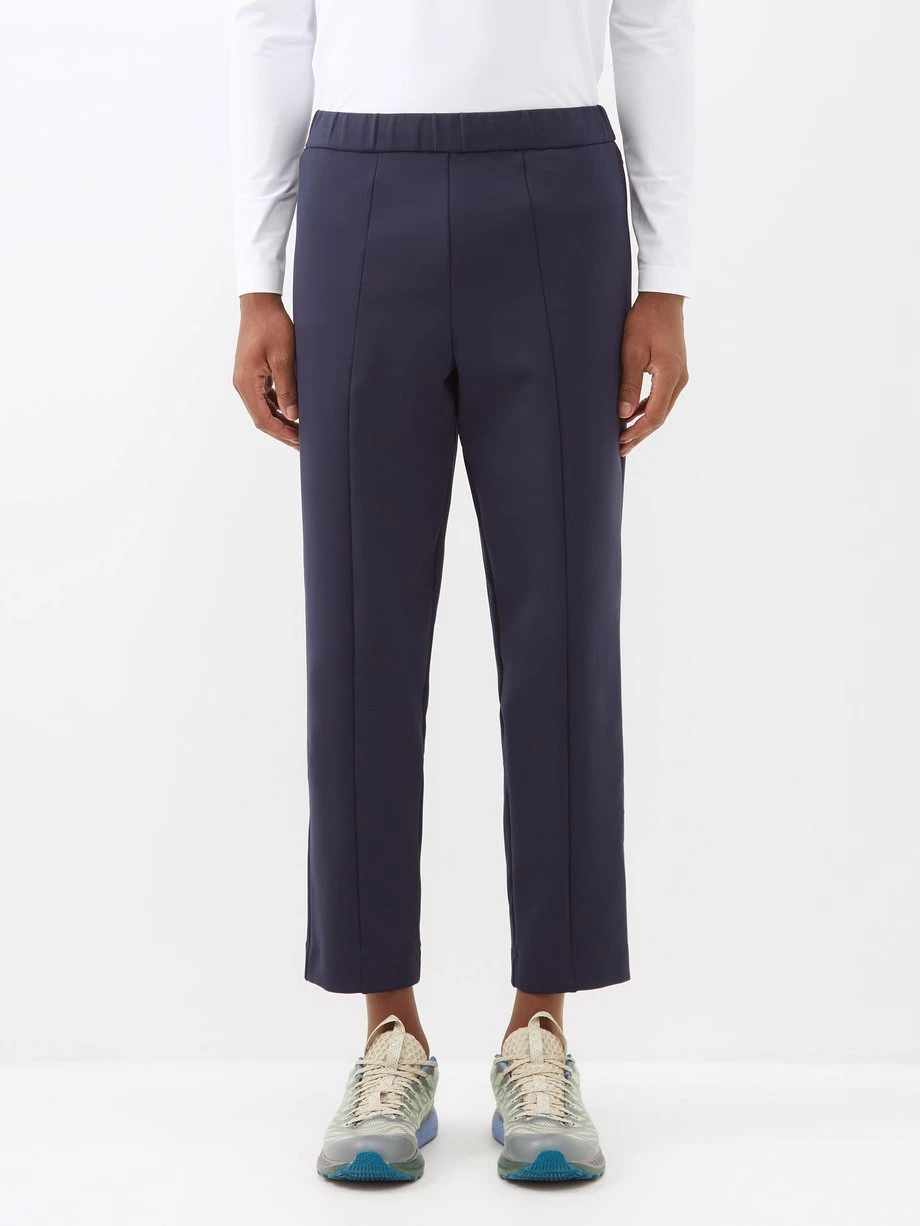 Jacques’ sartorial trousers have a refined fit and feel, cut from stretch nylon with tailored straight legs, front seams and slightly cropped cuffs.