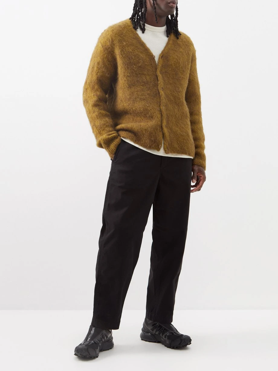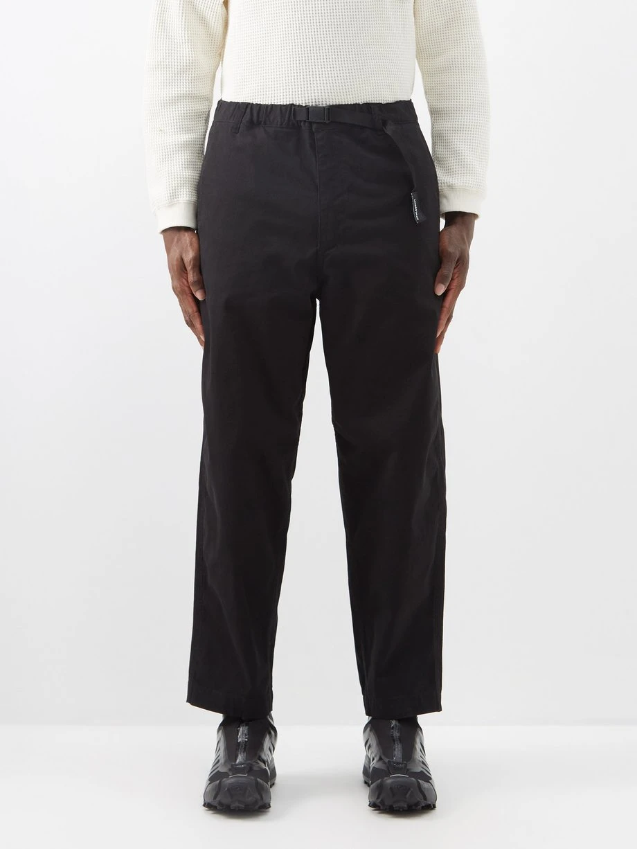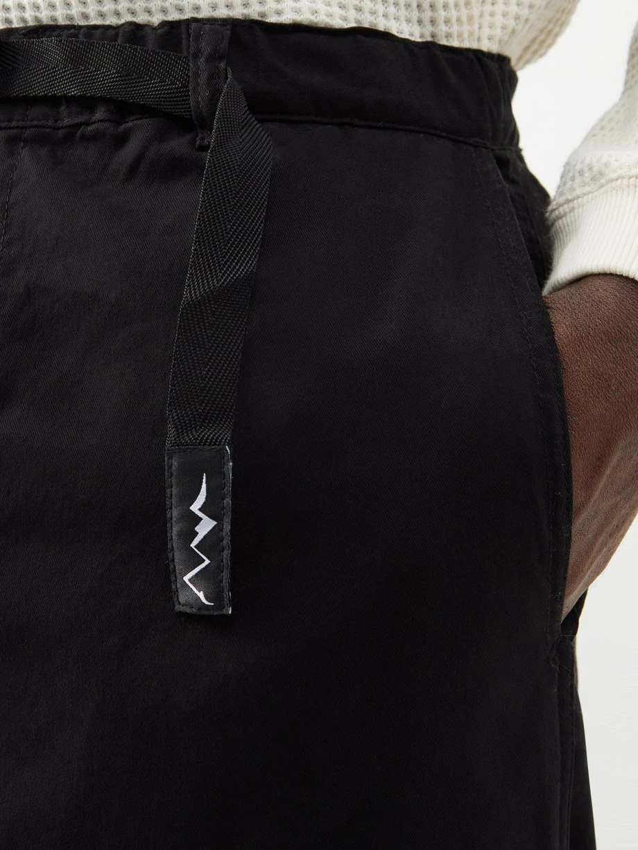 Manastash’s black Flex Climber trousers are made from a stretch cotton blend to a wide-leg silhouette and secured with a buckled belt.