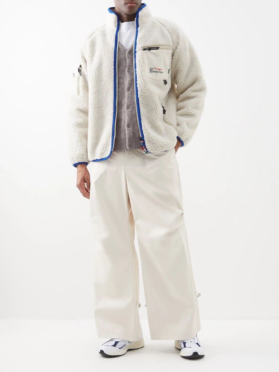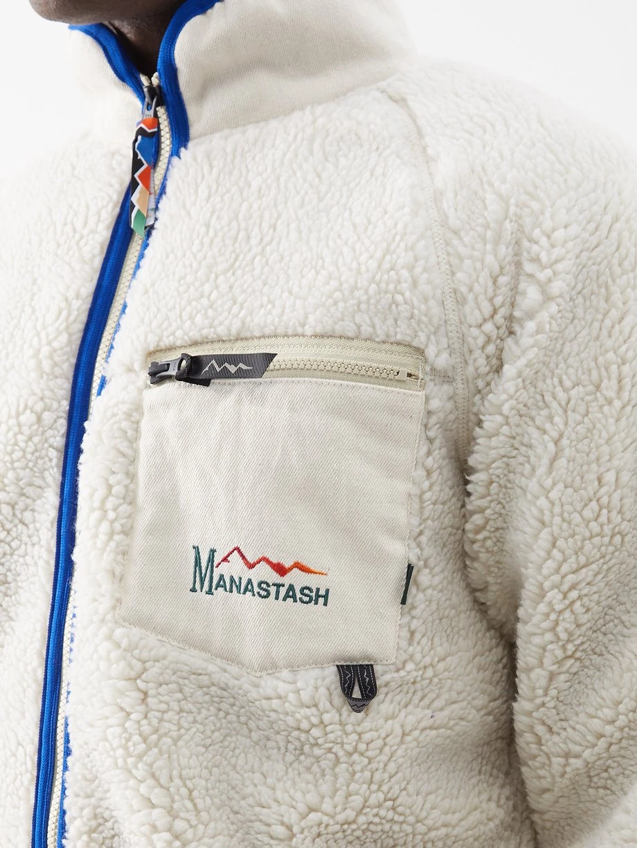 Ideal for the outdoors, Japanese label Manastash’s cream Mountain Gorilla windproof-fleece jacket has a robust lining, a hemp and cotton-blend collar and a zipped patch pocket.