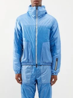 Moncler Grenoble’s blue Cretaz jacket is accented with internal harness straps that allow the style to be removed and worn as a backpack when weather permits. It’s made from water-resistant technical shell that’s quilted with insulating down and feathering filling to a slim fit with a drawstring hood and zipped pocket – ideal for holding a ski pass.