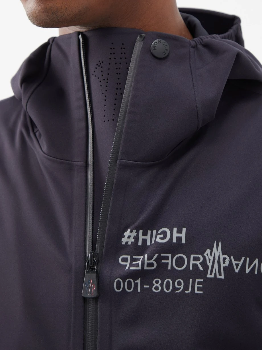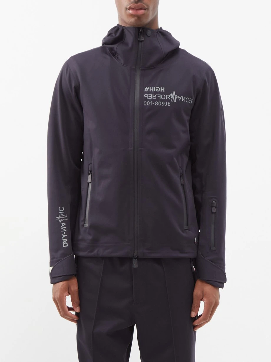 This lightweight black jacket is taken from Moncler Grenoble’s Day-namic collection and is imbued with water-repellent, windproof, breathable properties that make it ideal for everyday wear. Crafted from durable shell that’s printed with the collection’s logo, it has hermetically zipped pockets at the sleeves and front, then is finished with a hood.