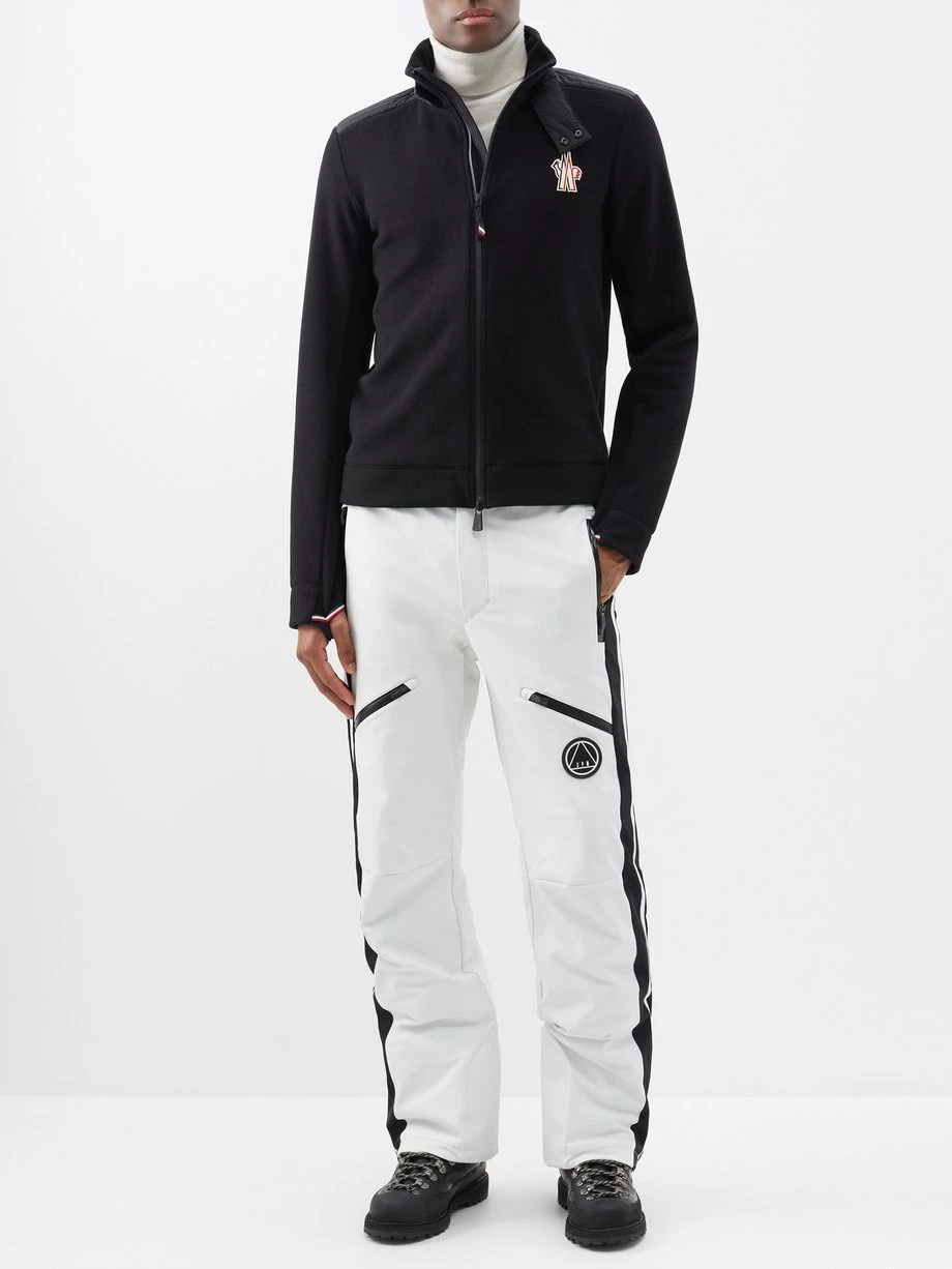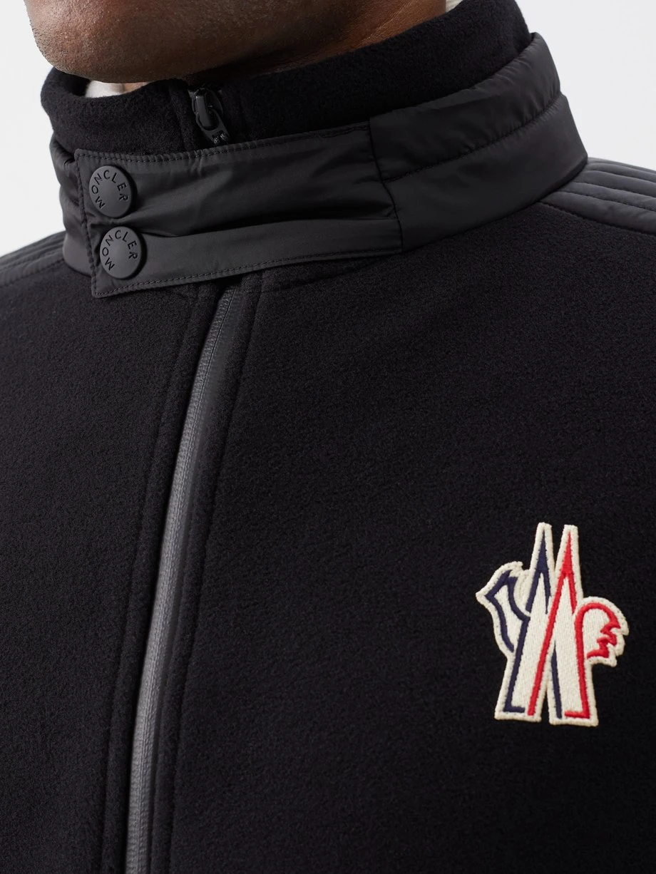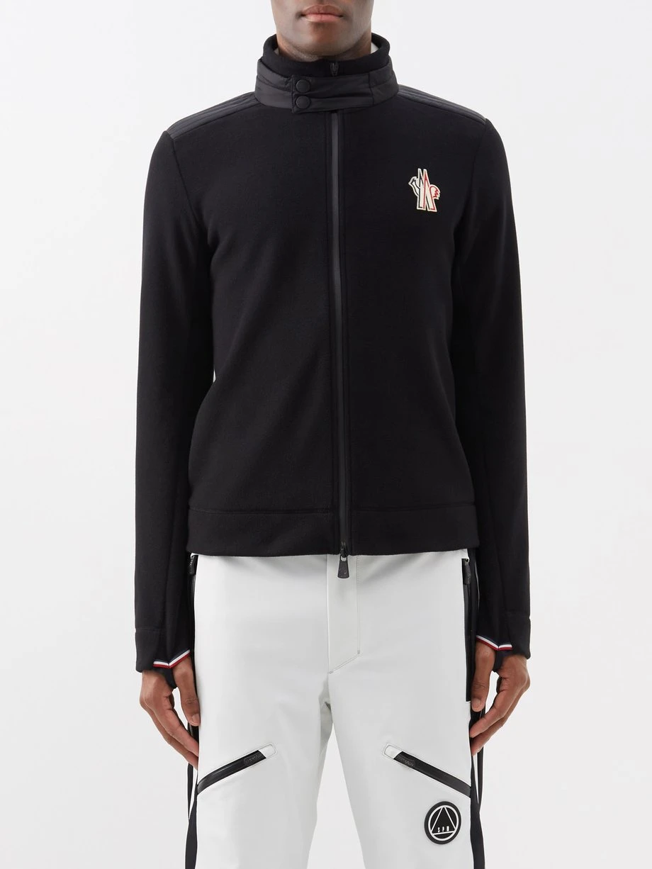Moncler Grenoble’s black top is crafted from a lightweight fleece with a zipped front and adjustable press-stud collar, recalling the label’s mountaineering heritage.