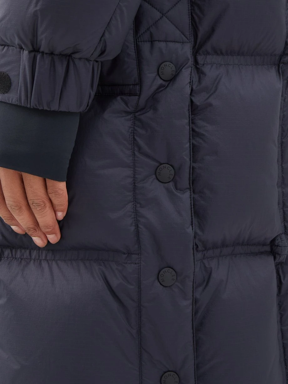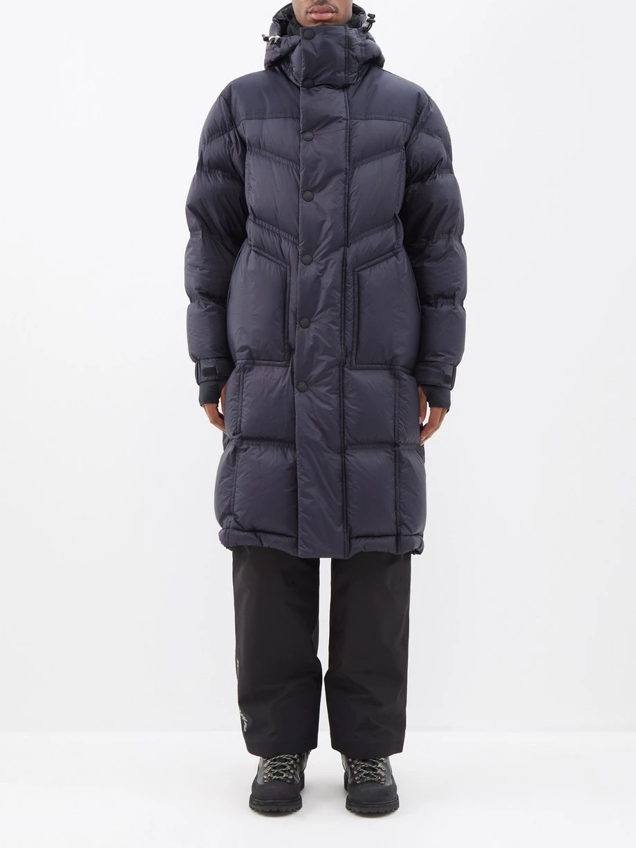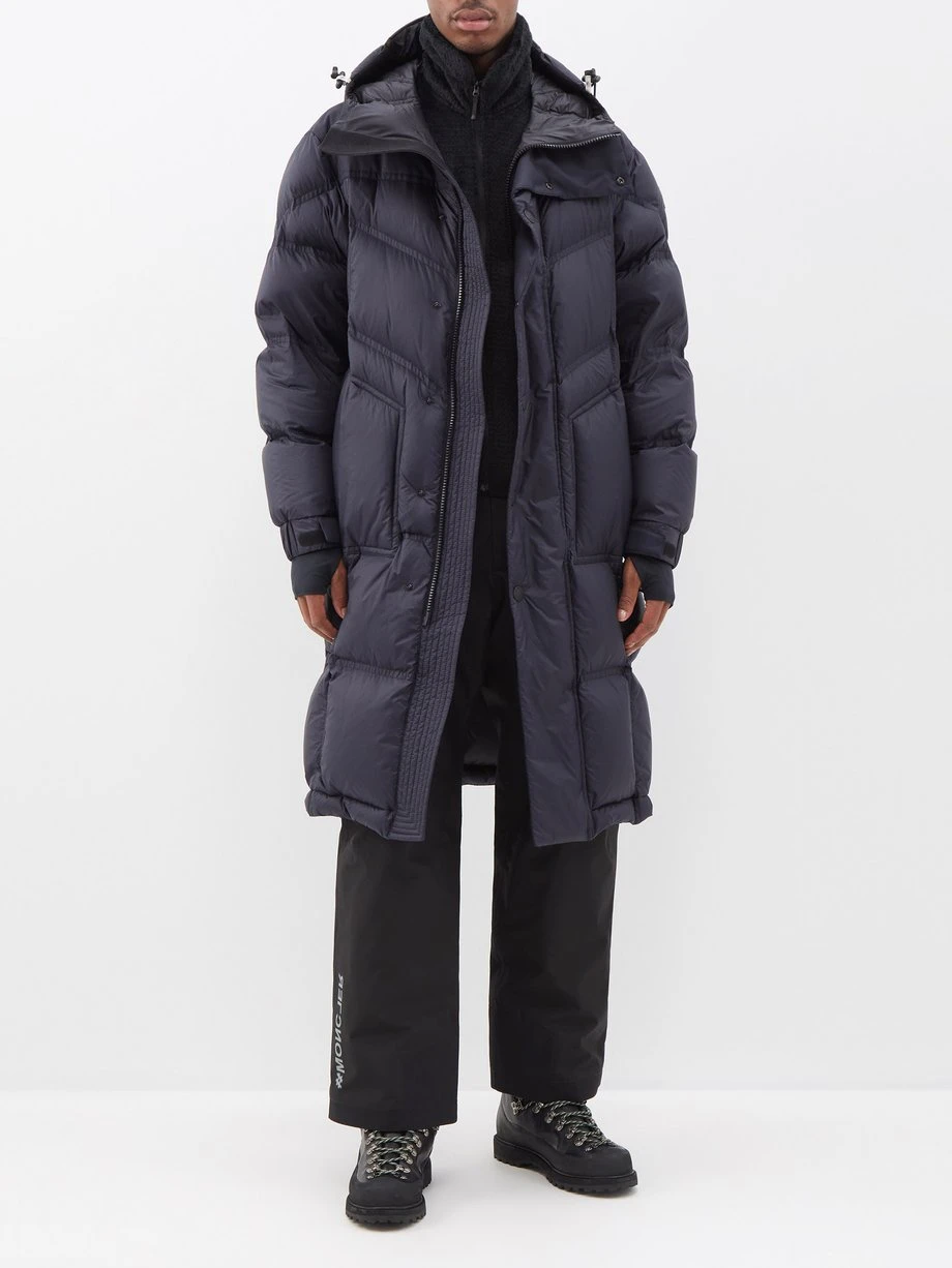 Moncler Grenoble’s navy Tratten coat is designed for high-altitude leisure and is fitted with a structured drawstring hood, stretch-jersey cuffs and a water-repellent longue saison lining. The outer is crafted from quilted, breathable ripstop with an insulating down fill to ensure a warm feel in colder weather conditions.