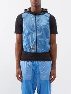 Moncler Grenoble’s black and blue two-in-one T-shirt is made from technical jersey with a hooded water-repellent shell layer that packs away into a pocket.