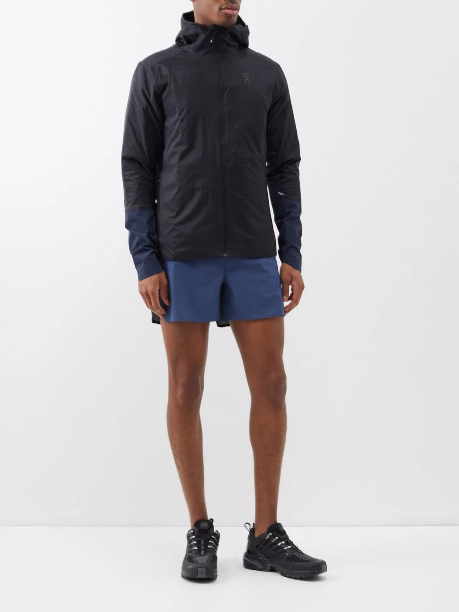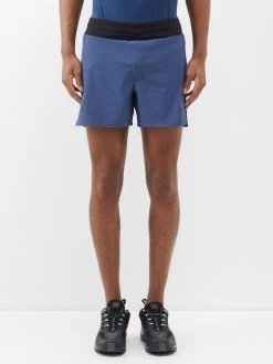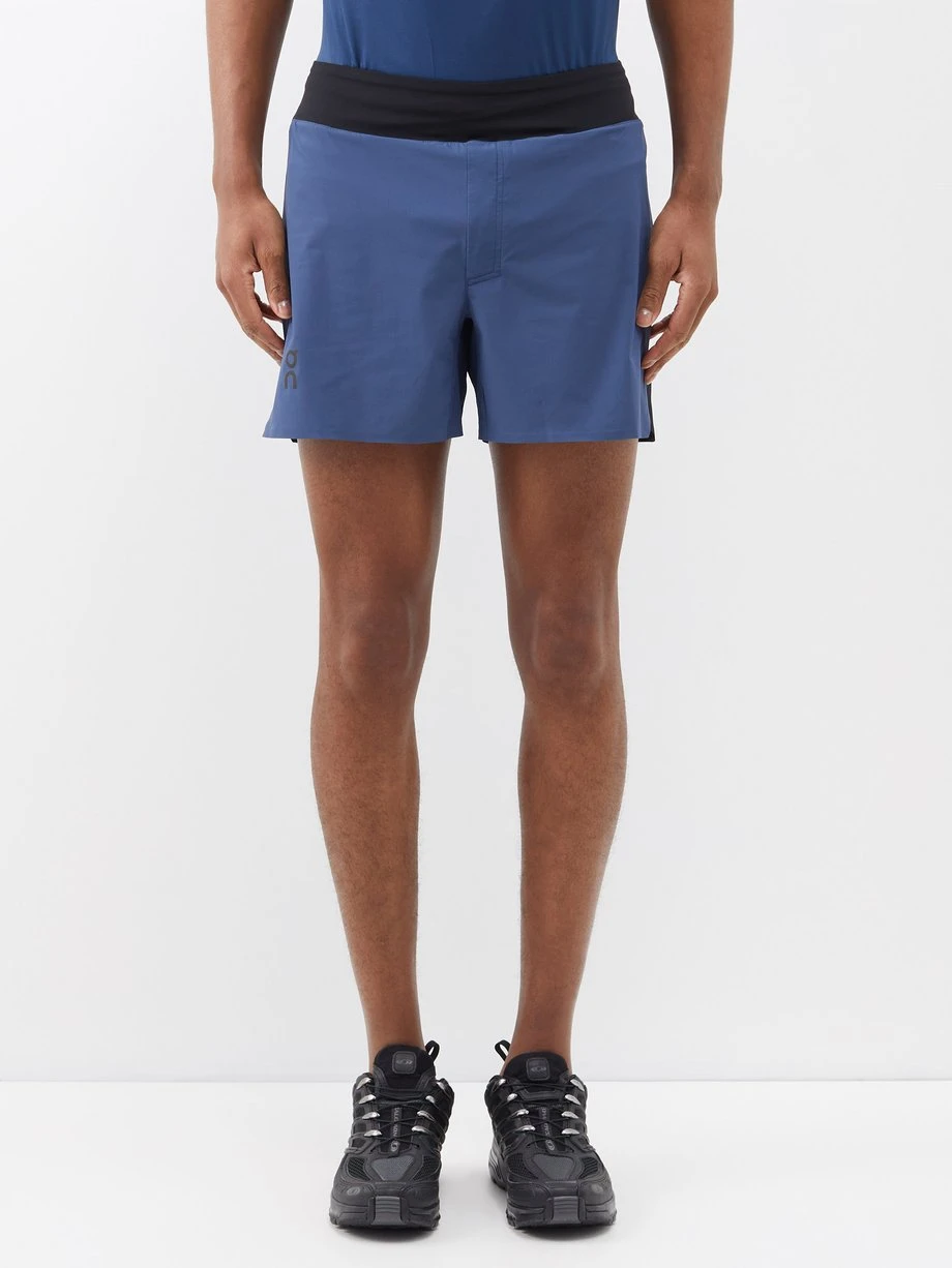 On’s running shorts have a 5″ inside leg and are panelled from blue and black recycled-fibre performance shell that beads moisture in light rain showers.