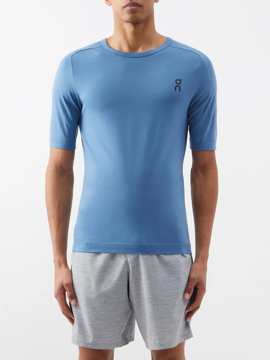 On is committed to garments that cater to the needs of runners, such as this blue T-shirt made from stretch merino-blend jersey for breathable comfort.
