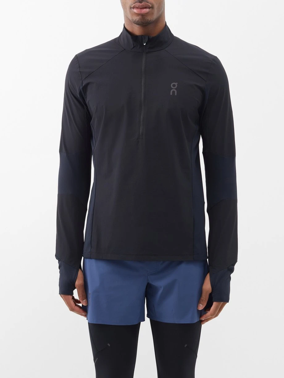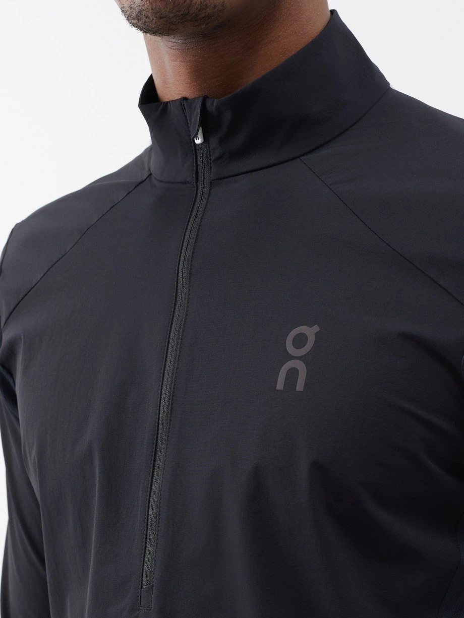 On’s black Trail Breaker top is panelled with breathable ventiliation and engineered with zonal water-repellent protection, plus an extended length zip.