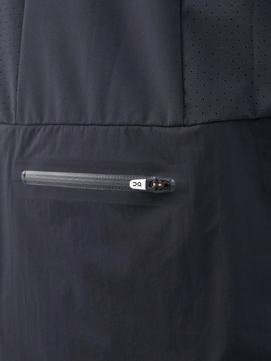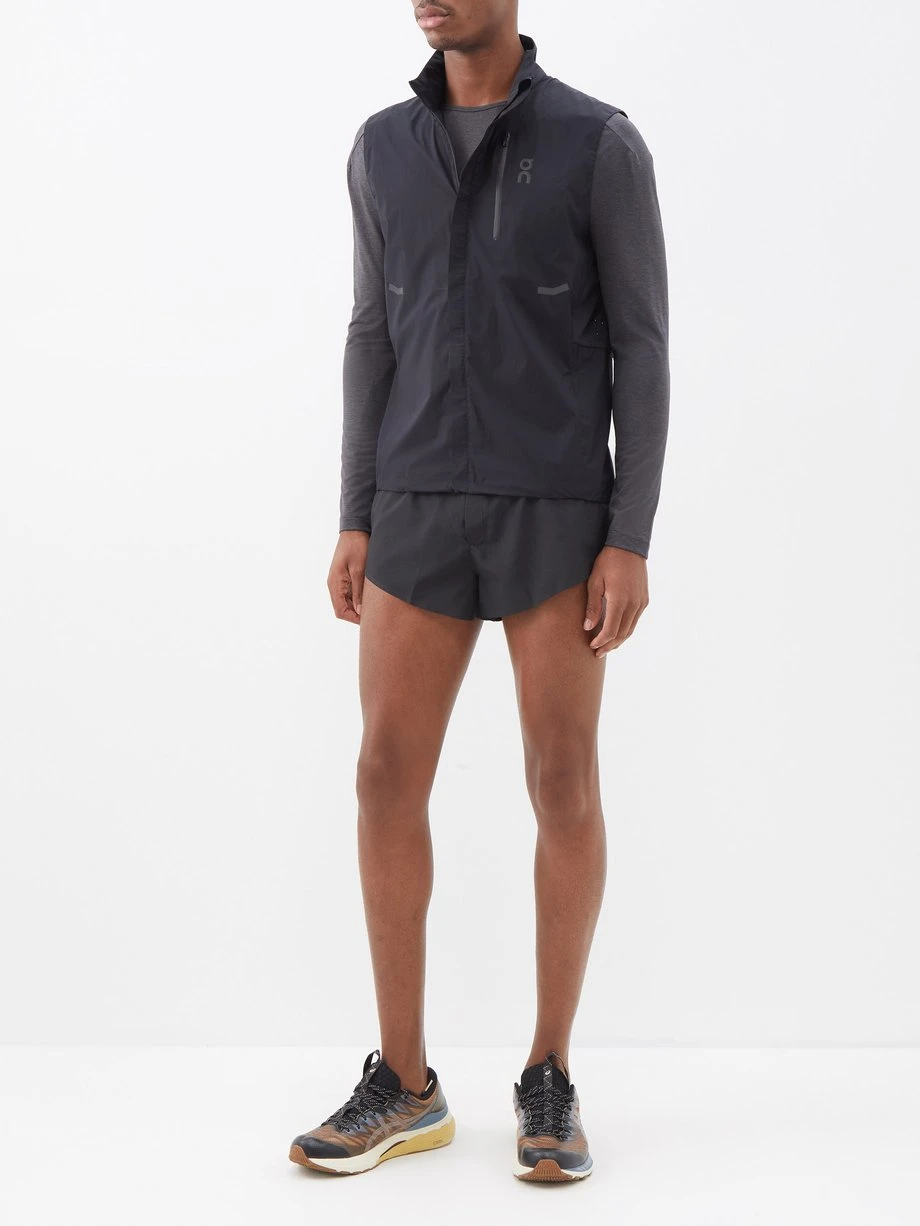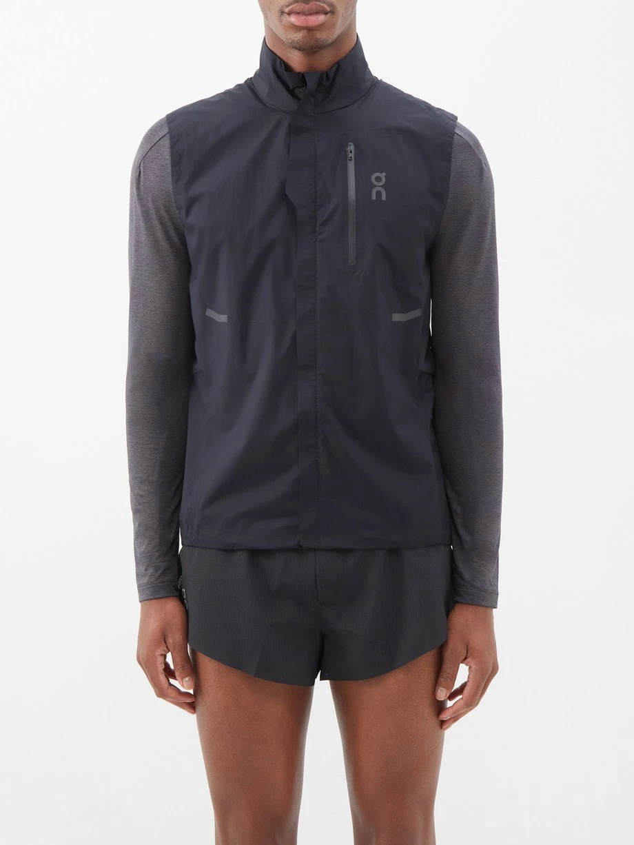 On’s black Weather vest is designed with a water-repellent coating on the front, waterproofed zip pockets and reflective elements for a safe and weatherproof run.