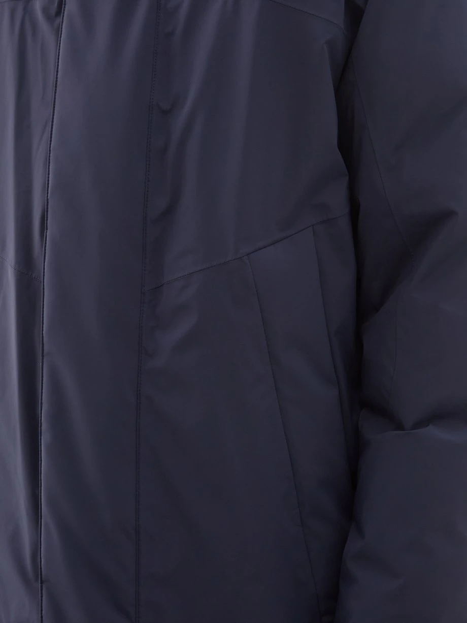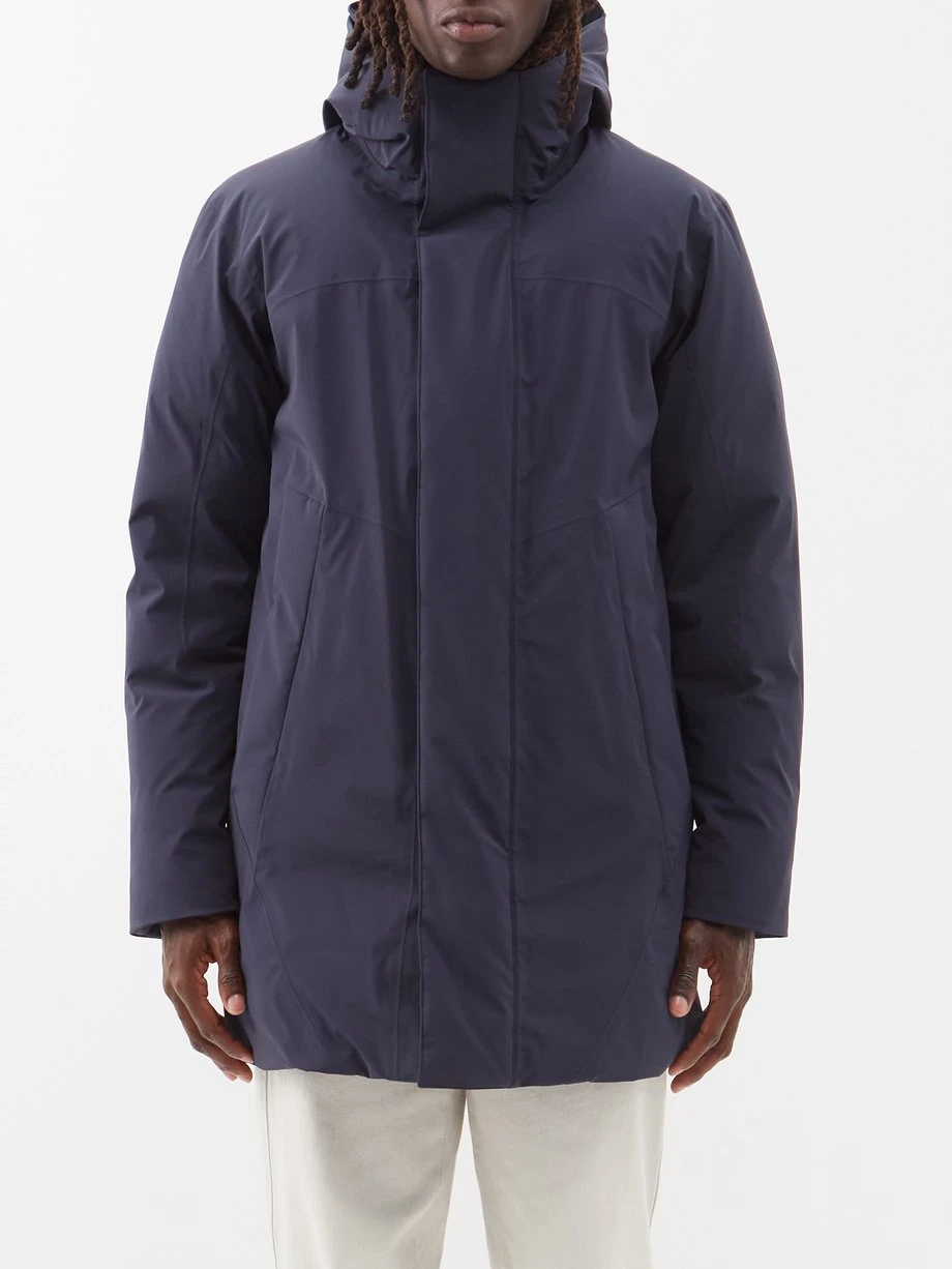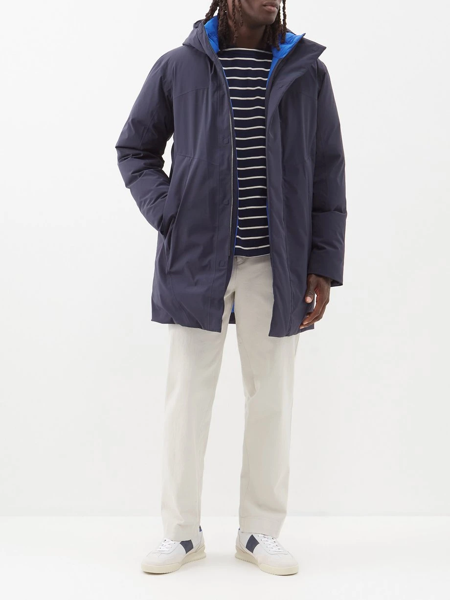 Orlebar Brown’s navy Zeller parka is crafted from down-filled shell with a protective hood and concealed zip front for a practical note.