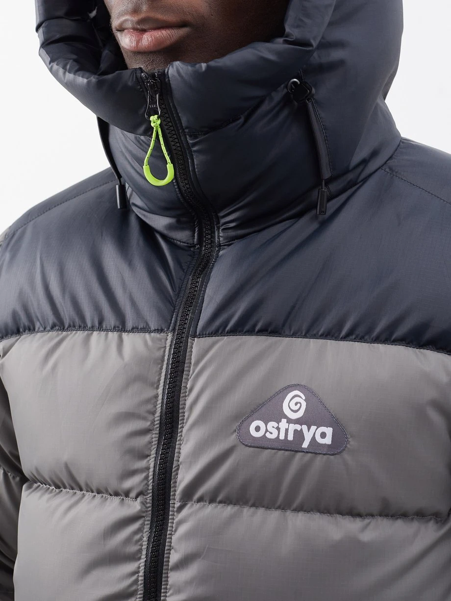 Ostrya’s grey Henson quilted coat is rendered from waterproof shell and filled with warming down and goose feathers, making it ideal for cold-weather conditions.
