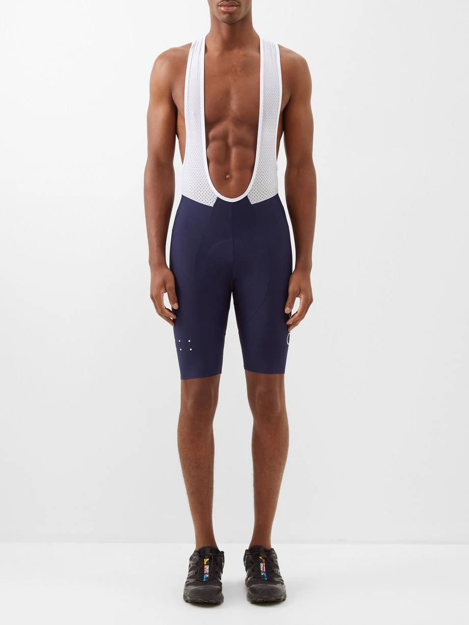 Pedla’s seamless navy SuperFIT bib shorts have stitch-free grip-lined cuffs and are designed for maximum aerodynamic comfort and optimal muscle support on trans-seasonal rides.