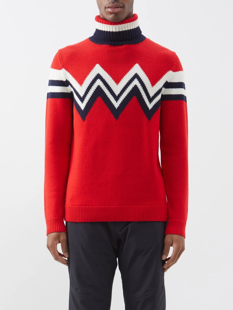 Perfect Moment knits this bold red Alpine sweater from insulating merino wool with a navy and white intarsia zigzag motif across the front.