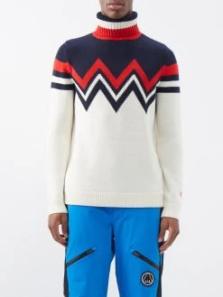 Perfect Moment’s ivory-white Alpine sweater fuses the heat-preserving properties of merino wool with a striking intarsia zigzag motif, apt for on or off the slopes.
