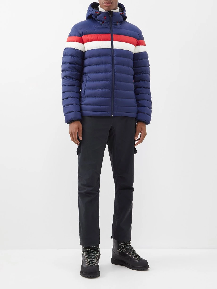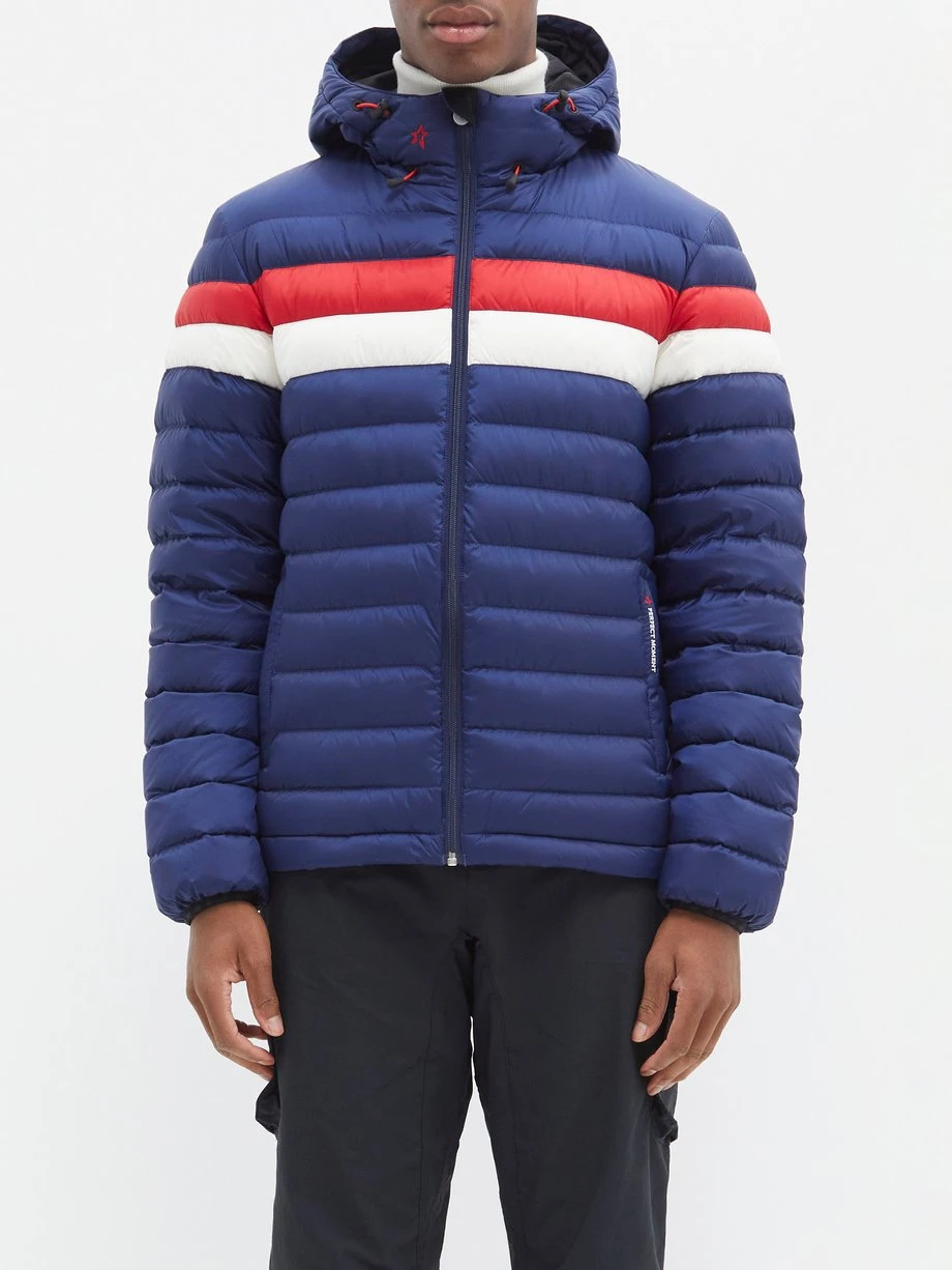 Perfect Moment’s French heritage informs the sporty navy, red and white striped design of this hooded Pirtuk ski jacket. The quilted outer is rendered in water-repellent nylon with an insulating down fill, then is lined with a snow gaiter for added protection.