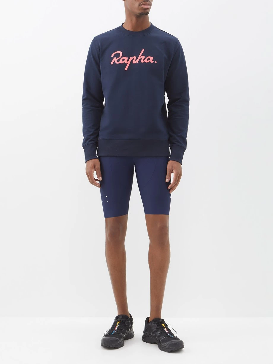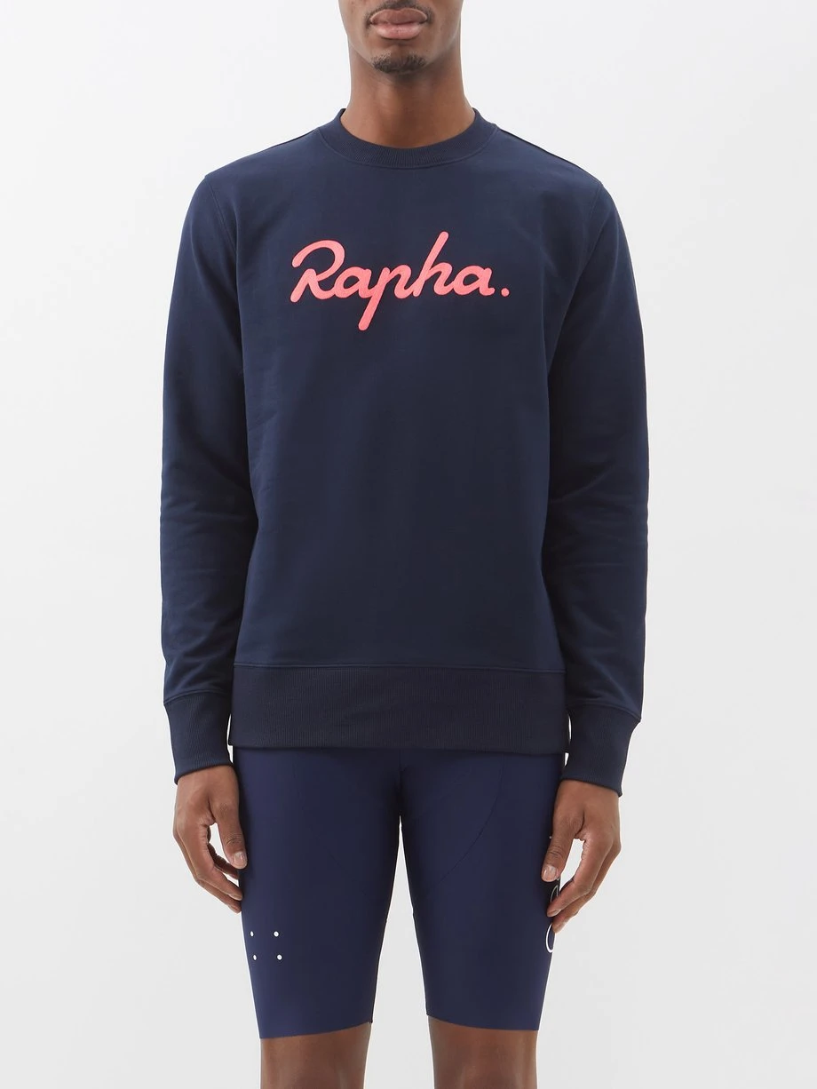 Ideal for layering during or between rides, Rapha’s navy sweatshirt is made from a soft cotton jersey with an orange chain-stitched logo.