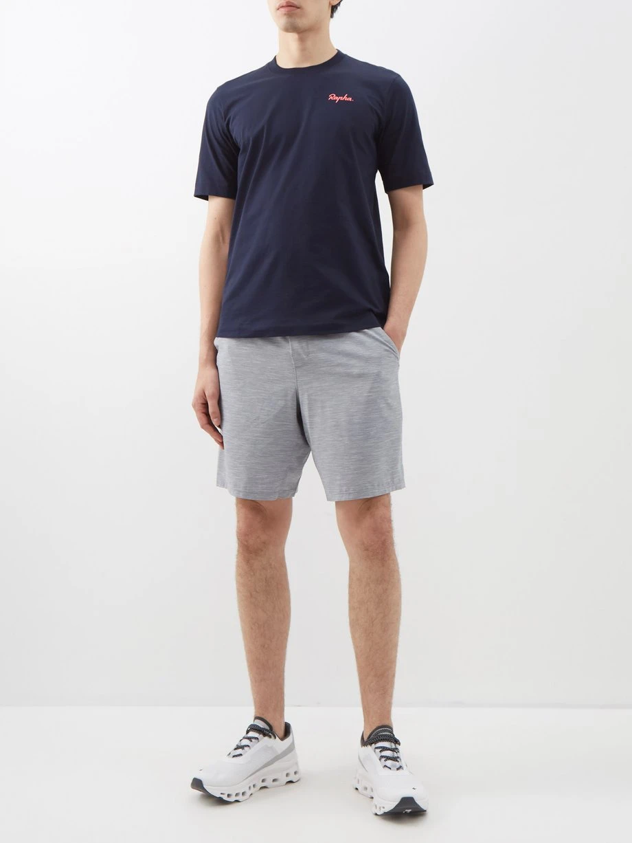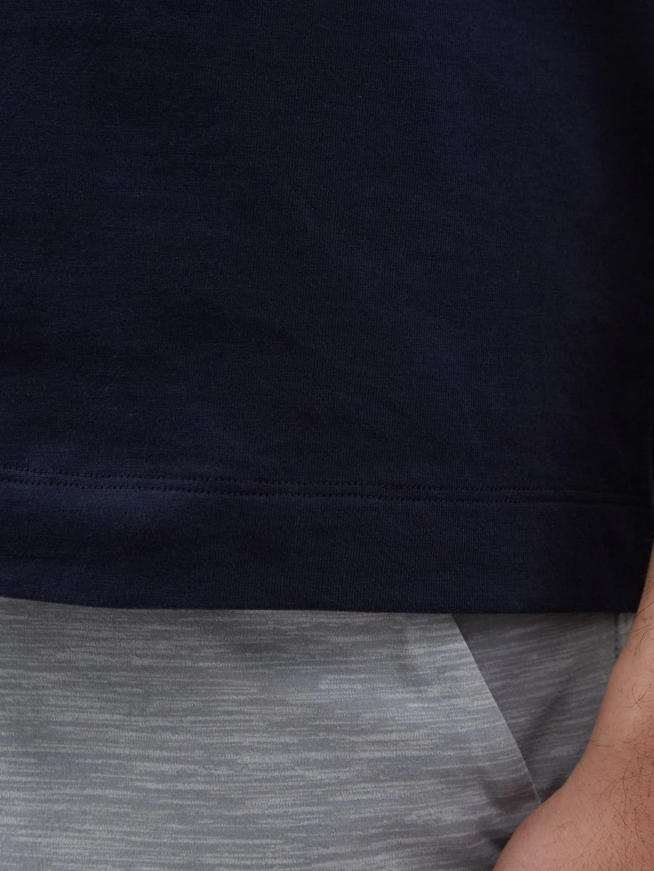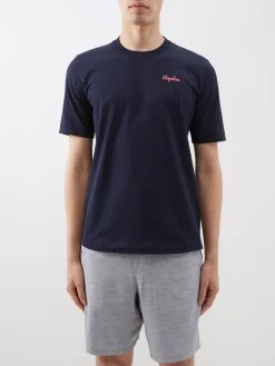 Made from 180gsm organic cotton jersey, Rapha’s navy T-shirt uses less water and eliminates the need for harmful chemicals and is finished with an embroidered script logo.