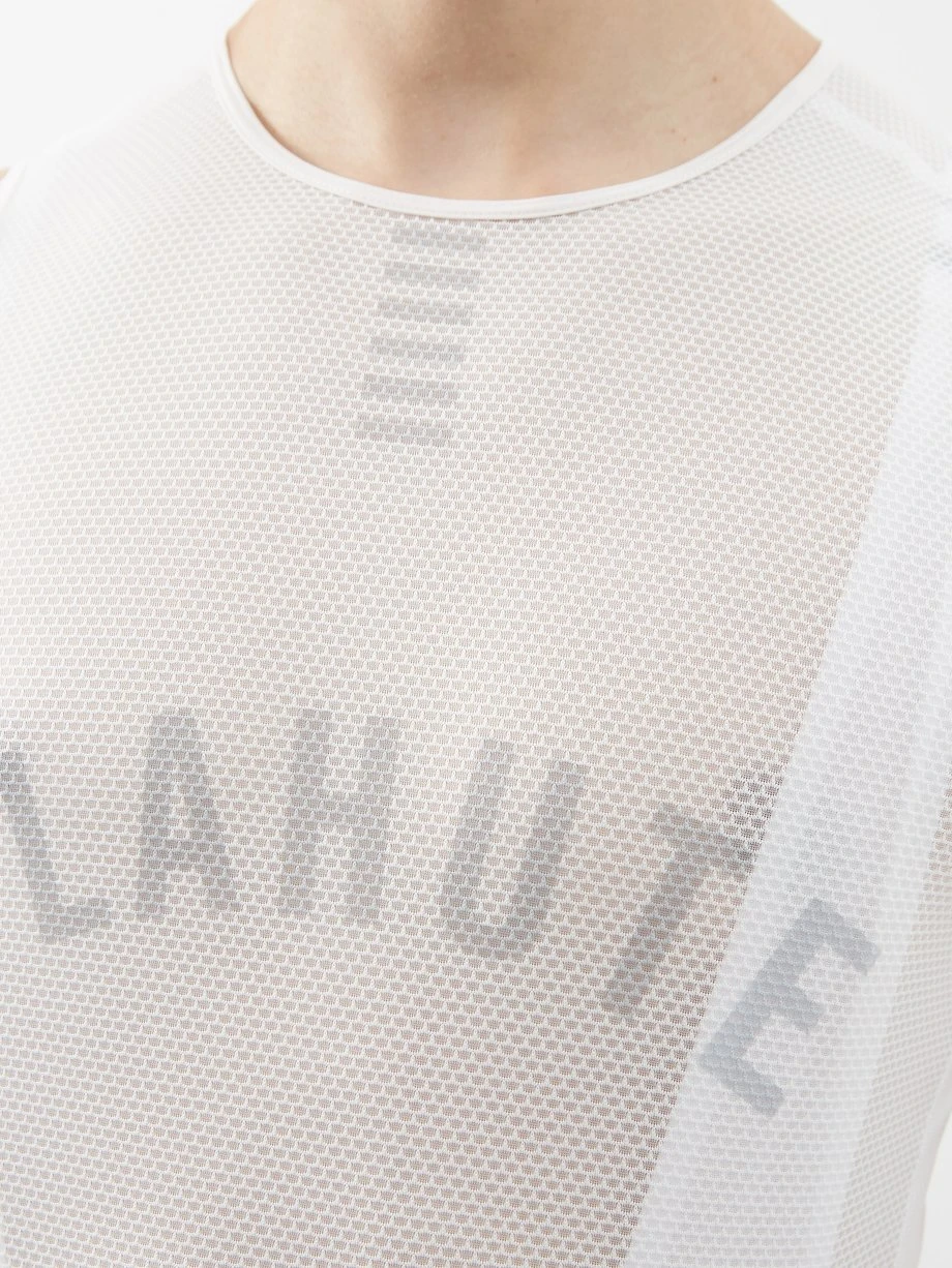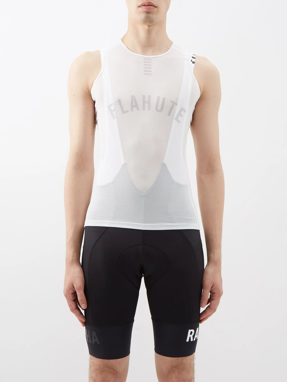 Rapha’s white Pro Team base layer tank top is made from a stretch moisture-wicking jersey that regulates body temperature for a more comfortable ride.