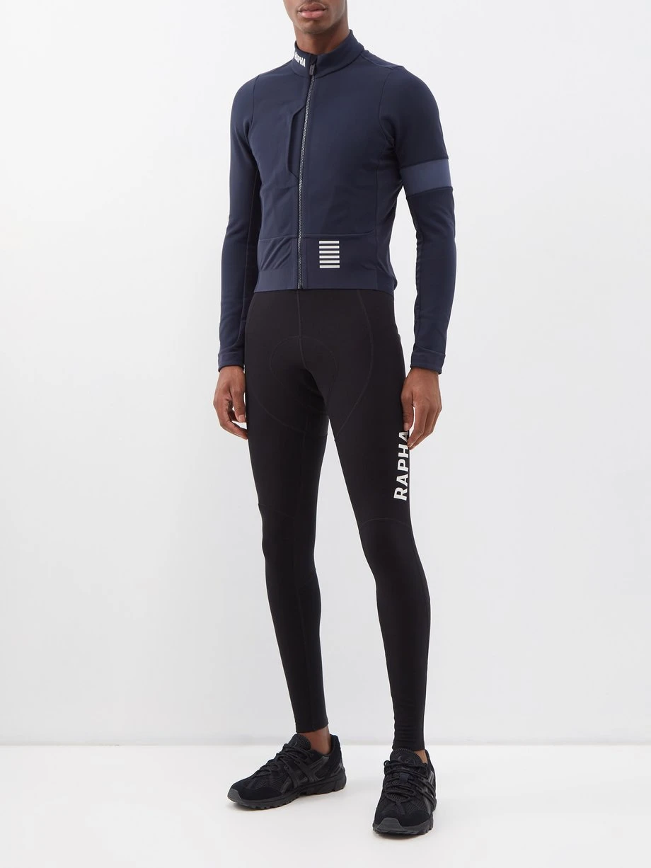 Rapha’s black Pro Team tights are made from stretch jersey with a chamois pad for optimal comfort and engineered panels for support and compression across the legs.