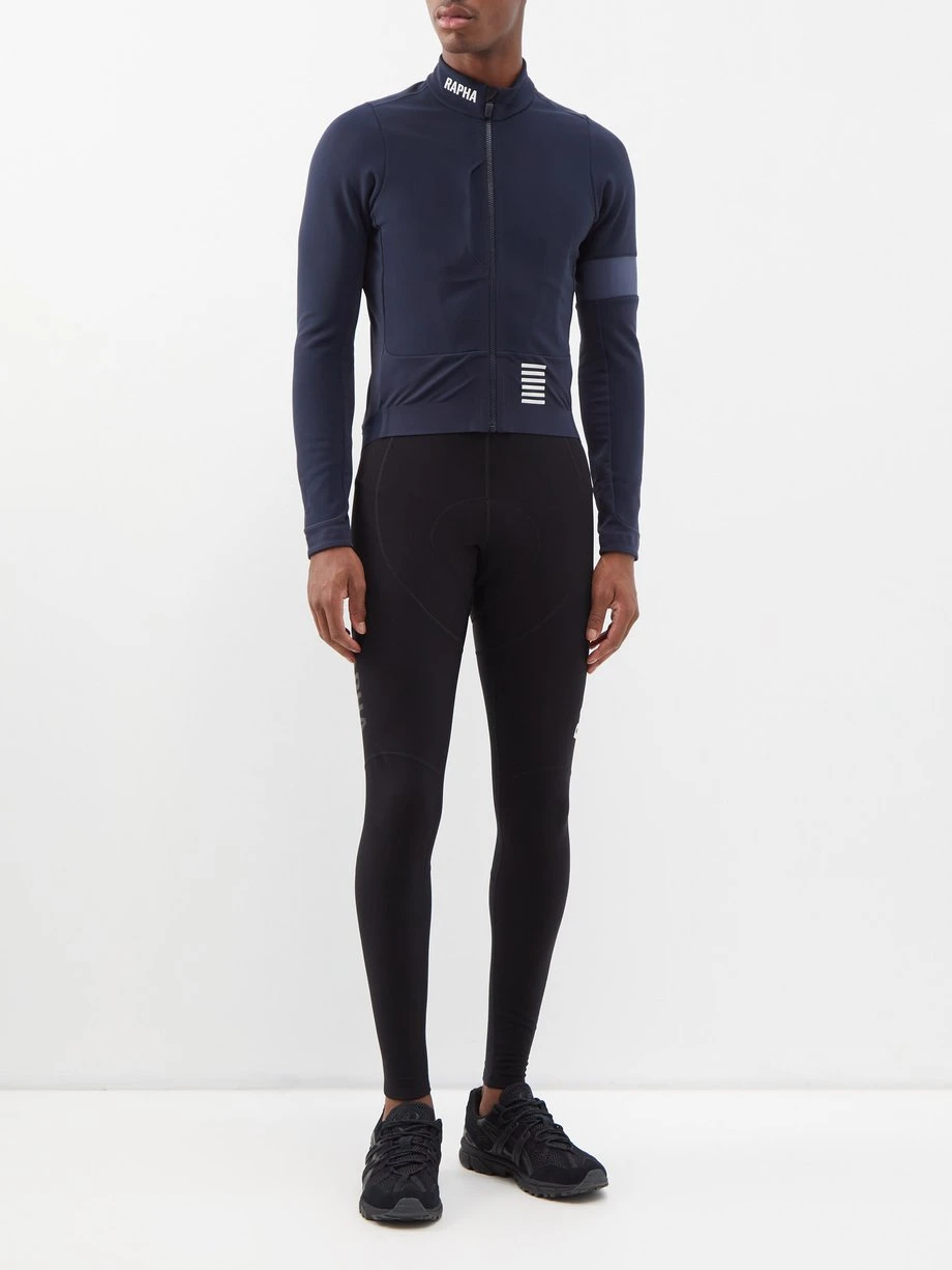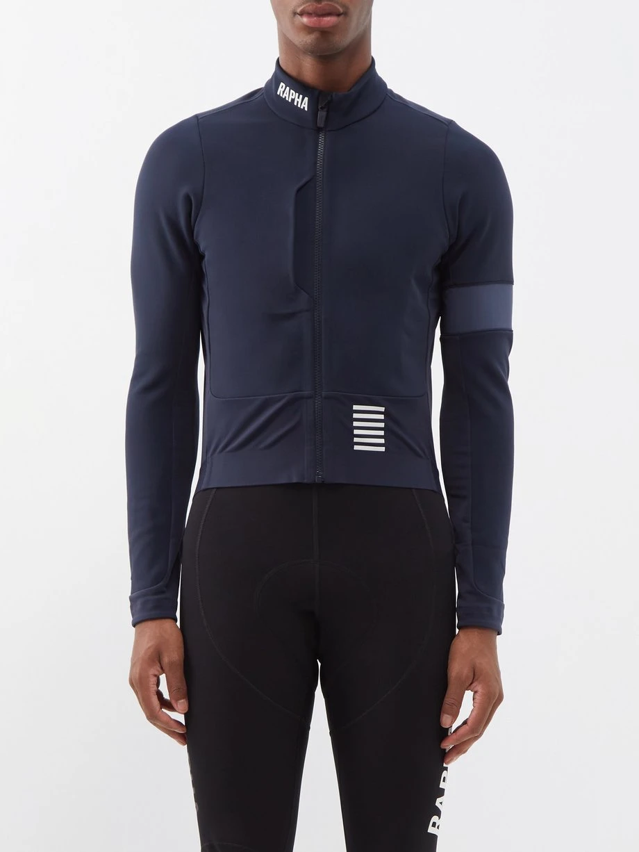 Rapha’s technical expertise informs this navy Pro Team cycling jacket, which is constructed from panels technical jersey specifically for riding in cold conditions.